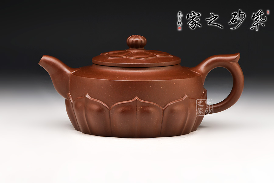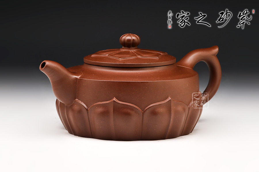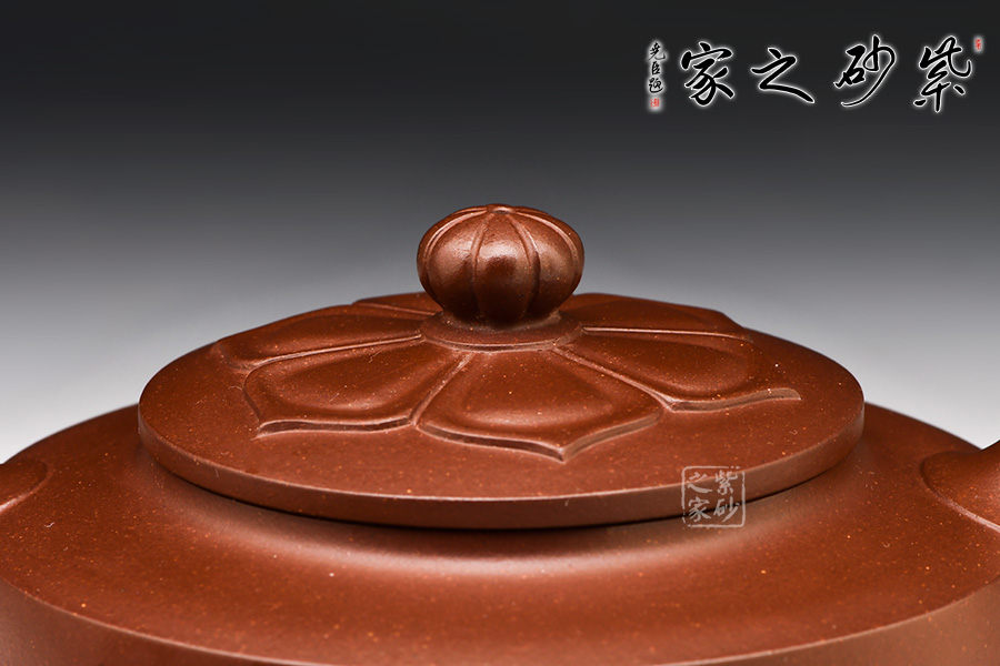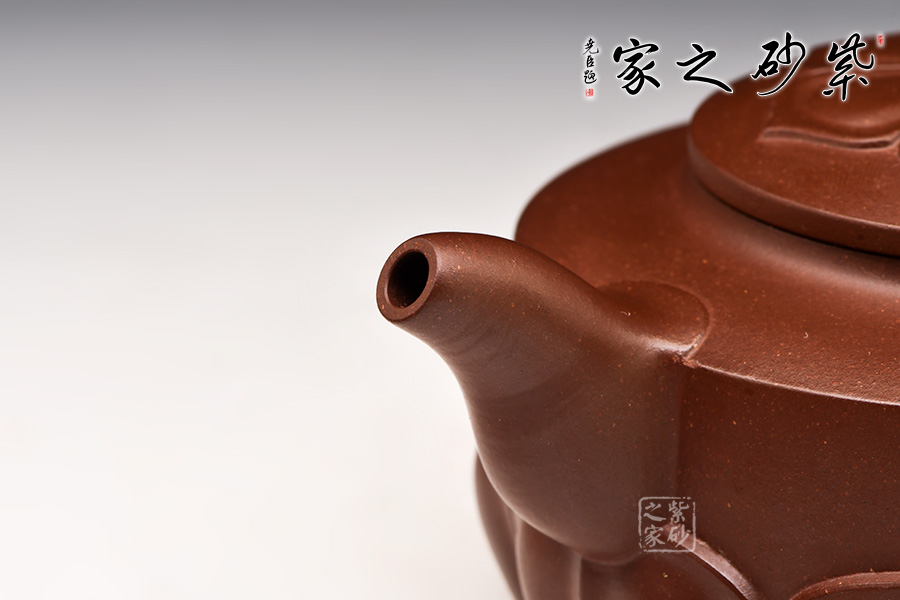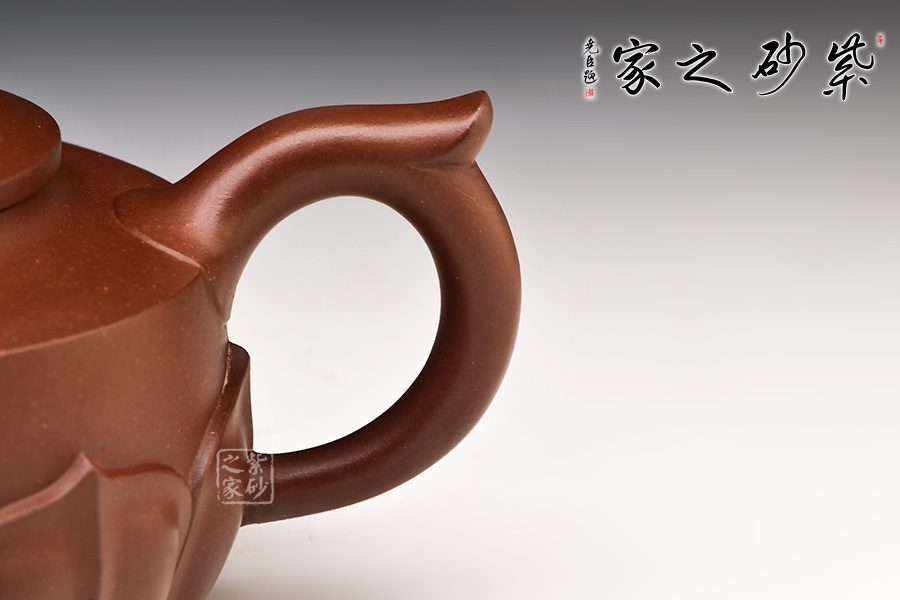 嘴把較為纖細修長,與整體甚是協(xié)調(diào)。荷花花苞為蓋鈕,與壺身相映,品茗賞蓮,皆為雅致之事。