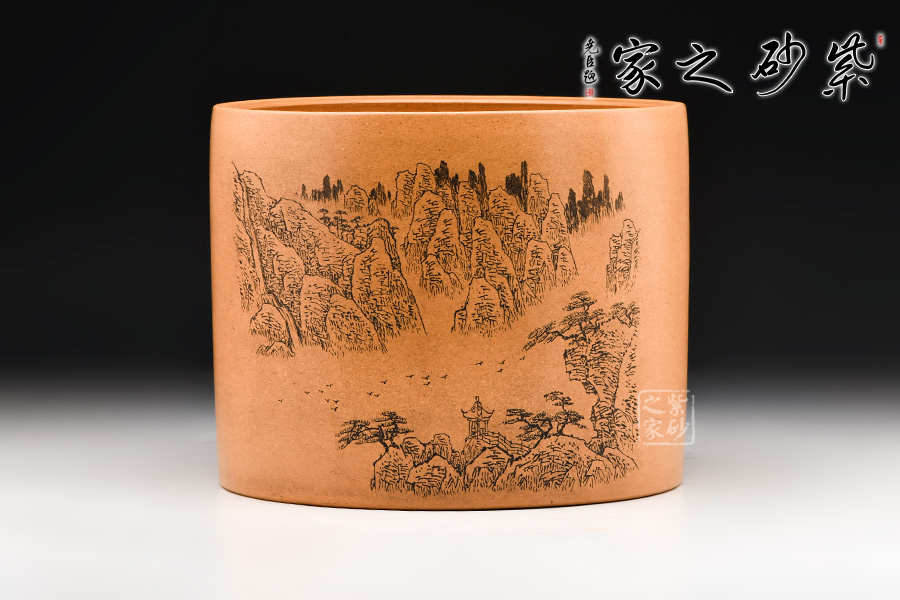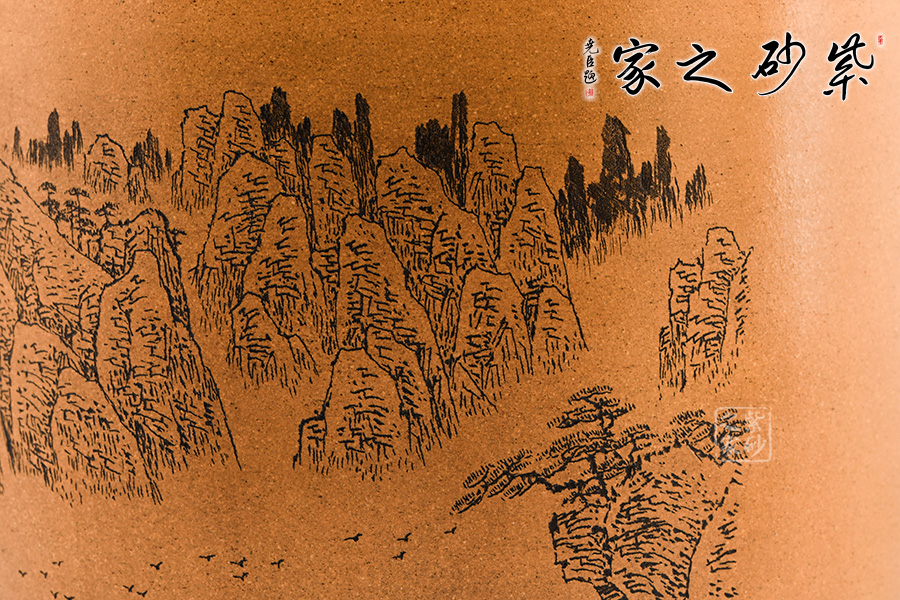 A面: 裝飾: 山水 裝飾者:譚泉海 裝飾內(nèi)容: 寄情于山水,陶刻功底鋒芒畢露,畫中之寫意回味無窮,刀法的處理礴放出了自然之靈氣,佳麗美景讓人懂憬。
