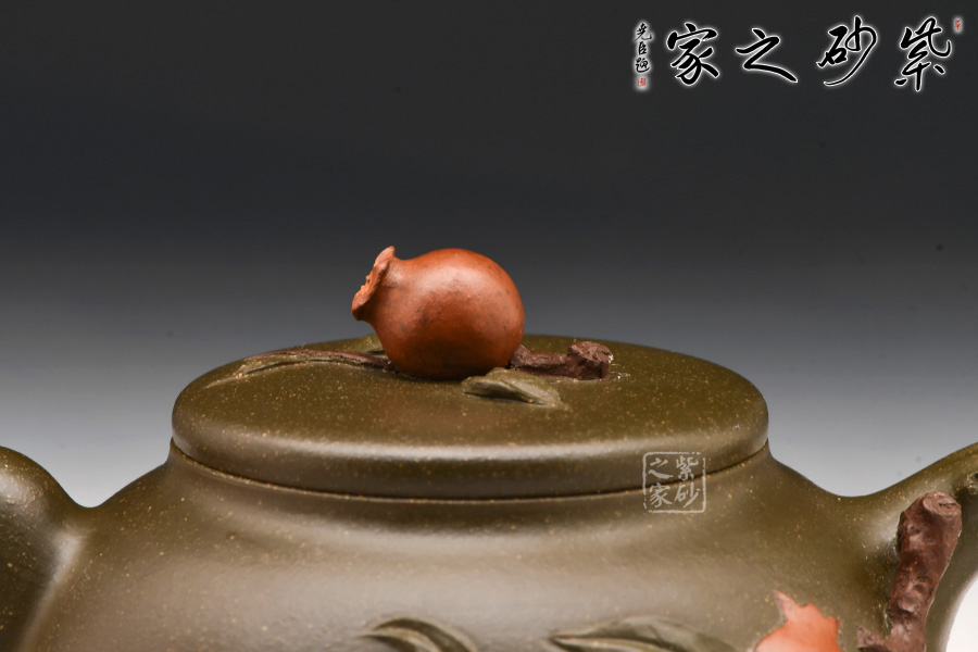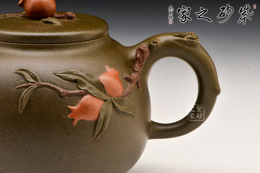 壺身上貼塑綠色的葉片、紅色的果實。壺鈕更是一枚大石榴,飽滿的外觀和鮮艷的色彩,讓人愛不釋手。