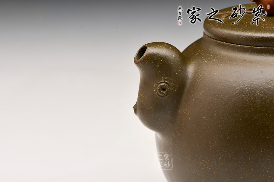 此壺用光素器結(jié)合貼花及雙色泥裝飾,既圓潤美觀又逼真自然。渾圓的外觀甚是細(xì)膩,壓蓋飽滿,短嘴彎流,枝節(jié)形耳形把,一收一放運用自如。