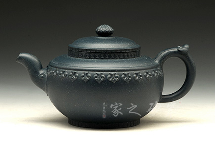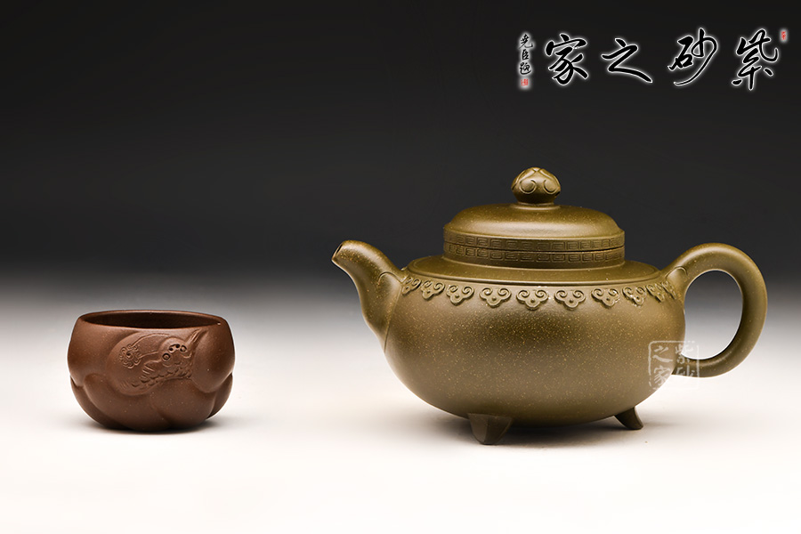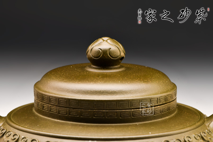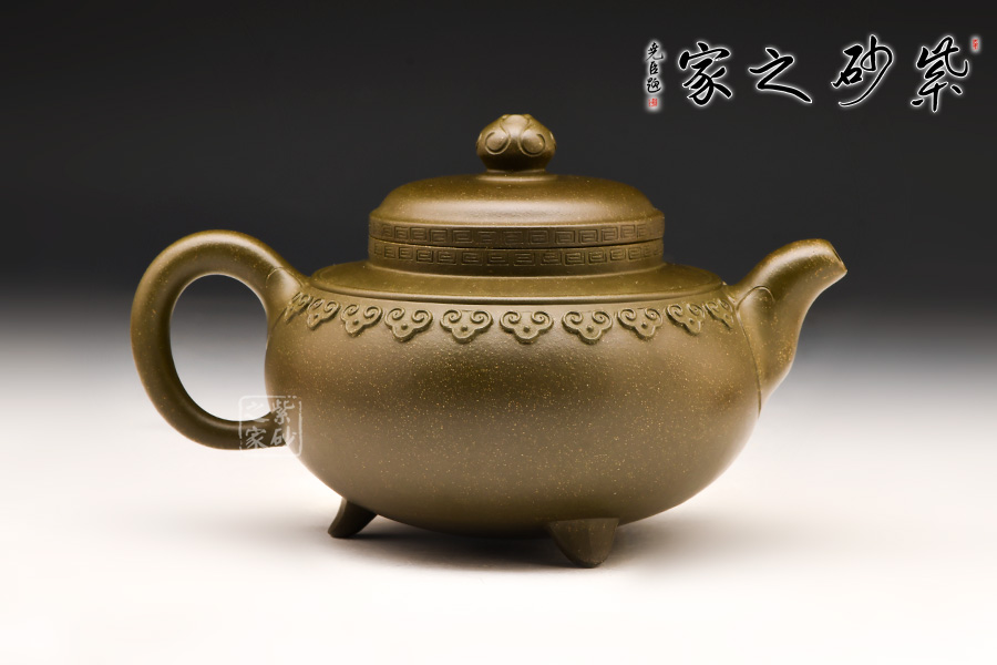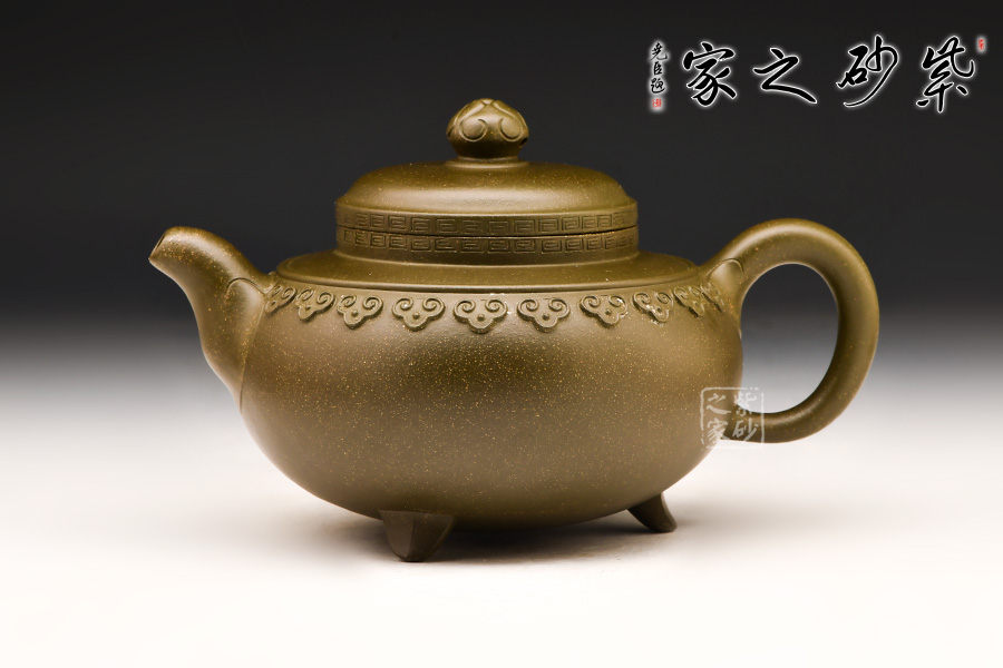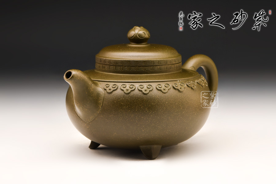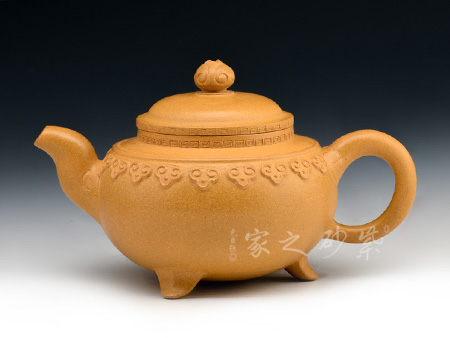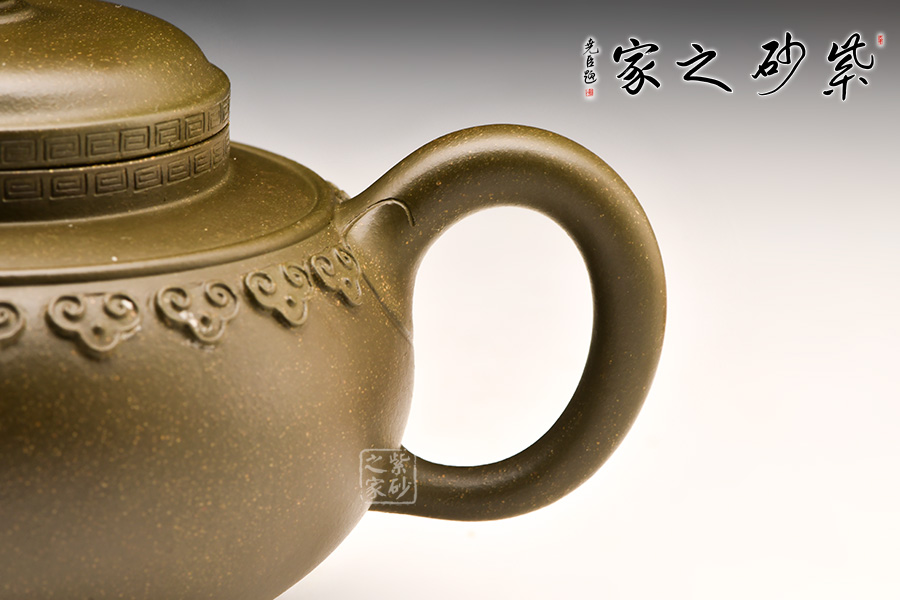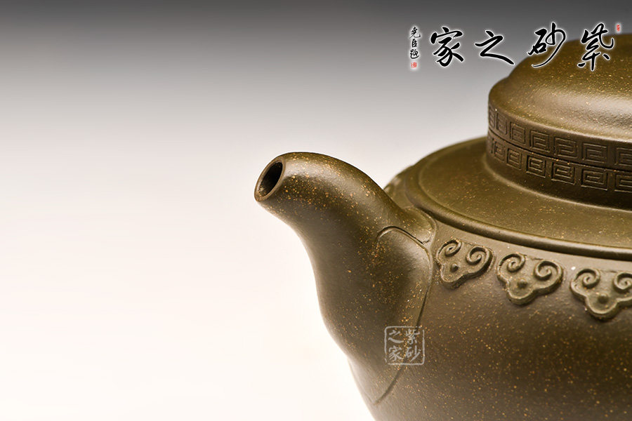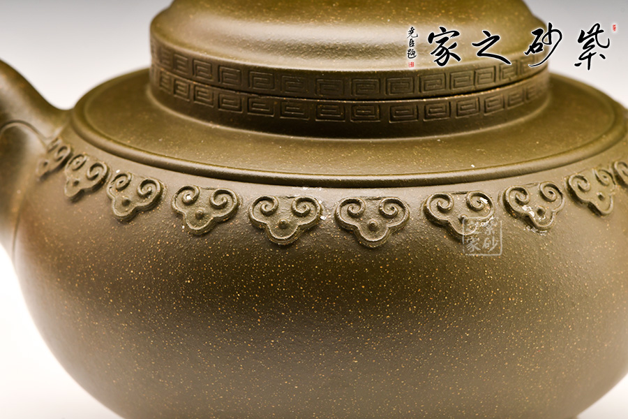 壺流呈以三彎流,執(zhí)把圓融有力,如意紋與流把呼應(yīng),進(jìn)而與肩部的如意云紋自然銜接,過度巧妙,增加了壺身的美感和造型的氣度。如意云紋飾于肩部,對(duì)仗工巧,每瓣如意紋都用薄脂泥粘貼,不但在感覺上起到整齊、流暢的效果,而且通體氣度渾厚凝煉。寶珠式壺鈕的四面裝飾如意云頭,云端向上,似花蕾含苞待放,并與外撇三足相呼應(yīng),使整壺呈現(xiàn)出一種縱向伸展的氣韻,盡顯挺拔之姿。