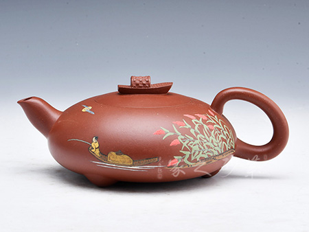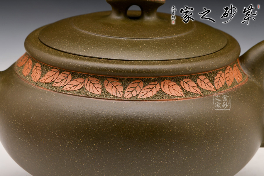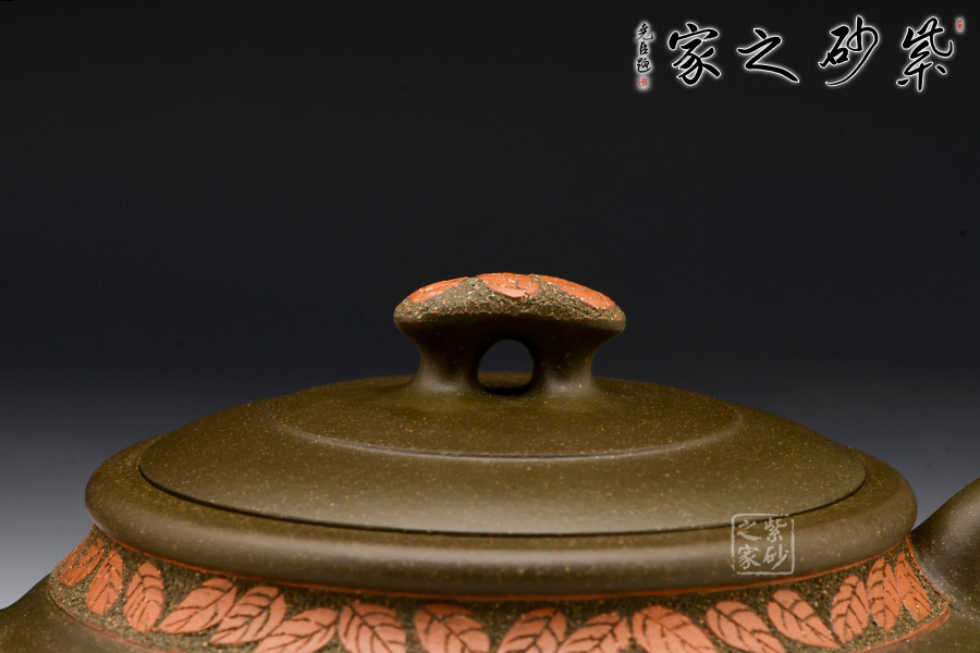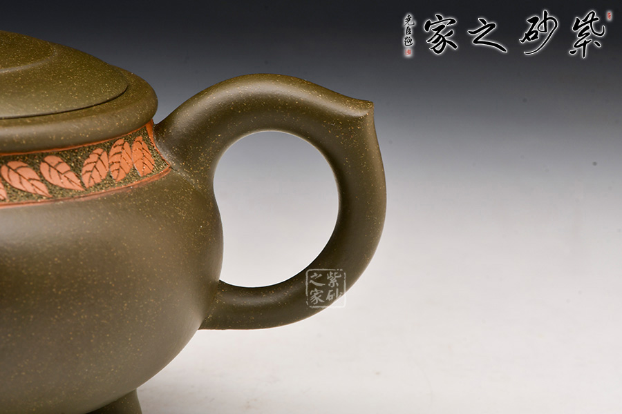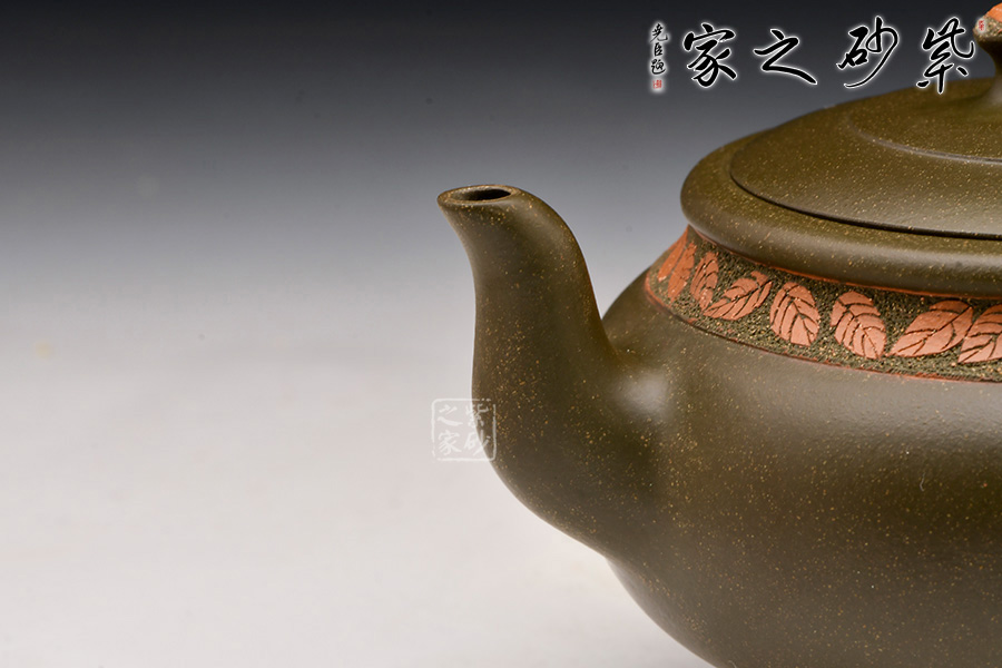 此壺“一葉知秋”,喻秋風(fēng)而過(guò),萬(wàn)物秋黃飽滿豐收。壺身與壺蓋兩者融為一體,貼切真實(shí),壺嘴把與壺鈕結(jié)合和諧,壺肩及壺鈕處雙色泥工藝裝飾“紅”葉,點(diǎn)韻主題,極富情趣。