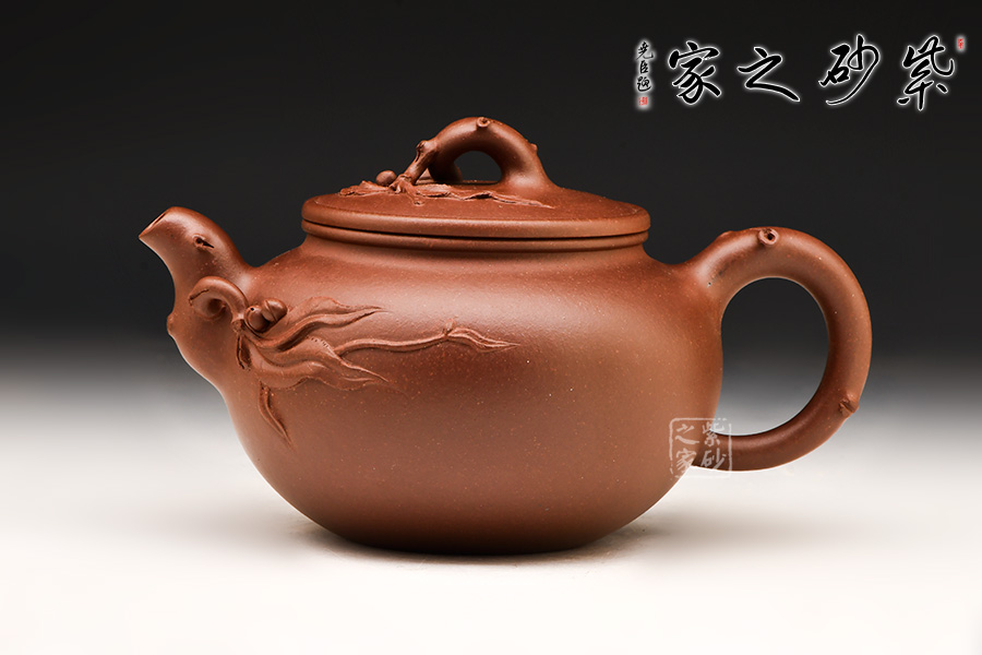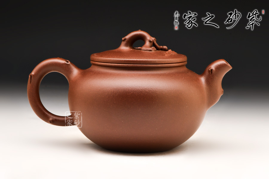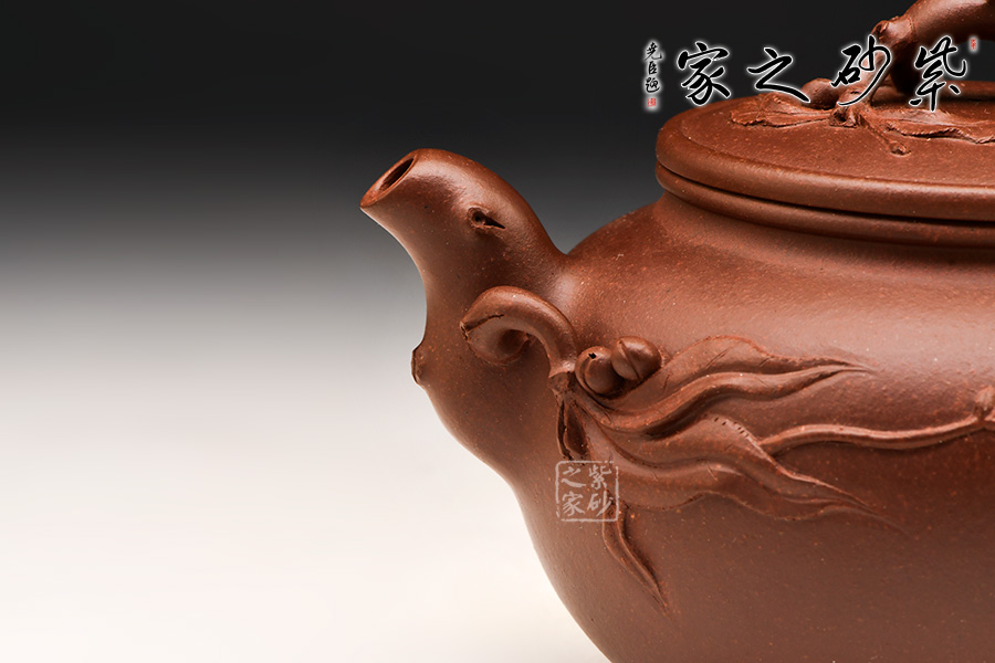 觀此壺,以飽滿的桃形為壺體,以彎曲的桃干作為流把鈕,枝干遒勁有力,流鈕根部蔓延出新枝,枝葉舒展,攀緣于壺身之上,幼桃墜于一側(cè),妙趣橫生。