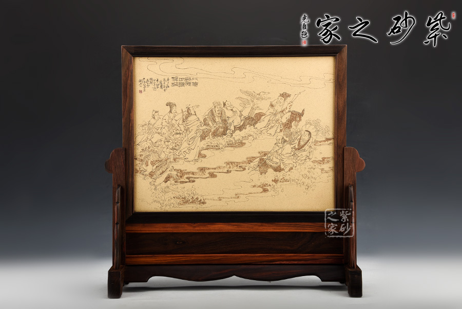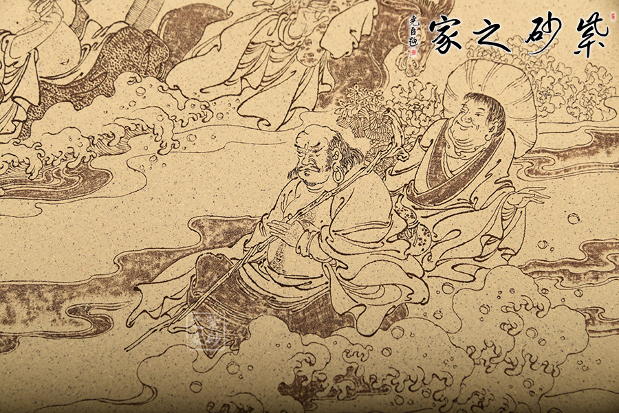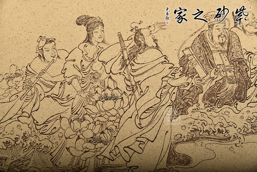 此款“八仙過海插屏”是范小君老師自制自銘的,本山綠泥全手工制作。以八仙過海為主題制作而成,刻畫細(xì)致,人物神情、須發(fā)、衣物,及至蓮花、海浪,精細(xì)入微不外如是。 是一款不可多得的紫砂插屏,和書房、客廳都是絕配。