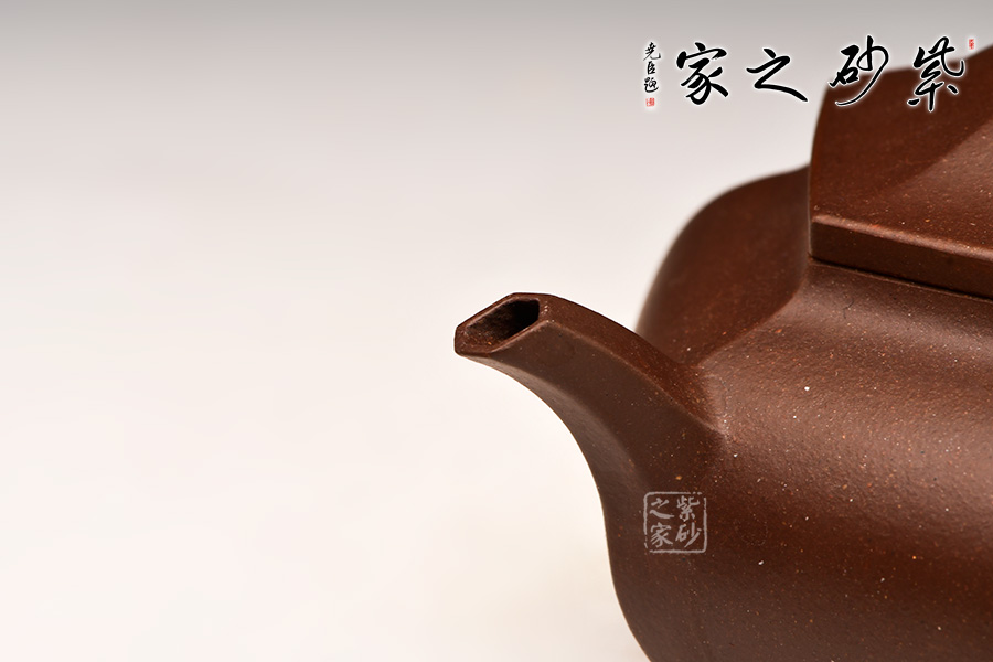 二彎流六方壺嘴自然胥出,壺蓋、壺鈕、壺把、壺身同是六方形態(tài),和諧統(tǒng)一;且流把及壺鈕三點一線,協(xié)調(diào)不亂,子母線嚴絲密縫,整款器型匠心獨運,心思巧妙,此乃潘壺中的又一經(jīng)典之作,饋贈還是自用,都別有一番韻味。