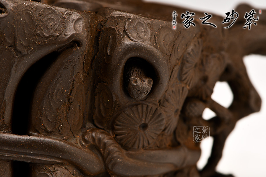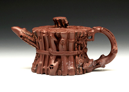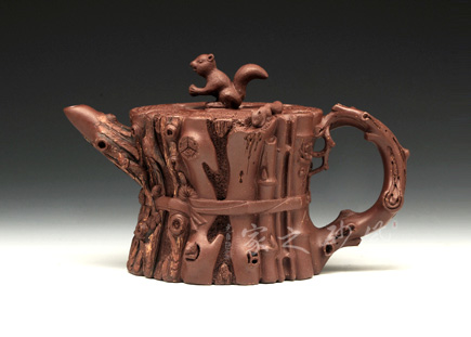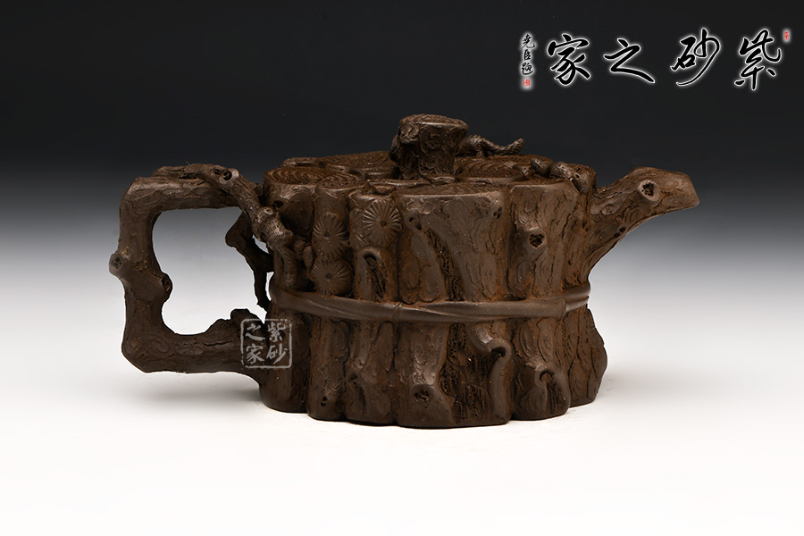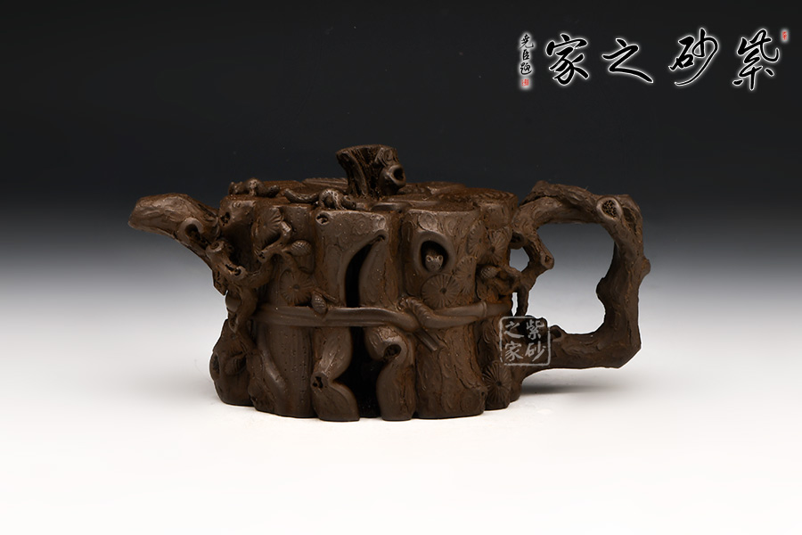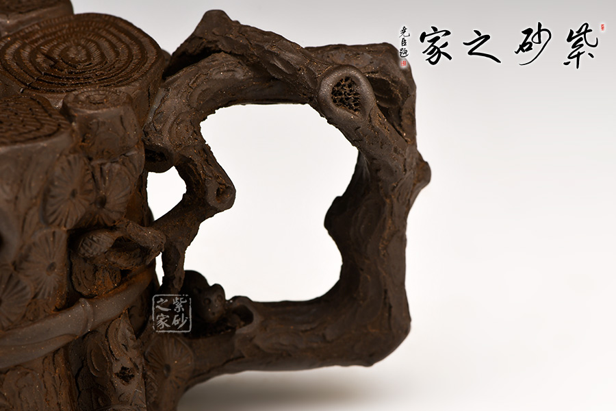 這款“束柴三友壺”運(yùn)用花器制壺的理念,惟妙惟肖、師法自然,技術(shù)上采用紫砂塑形獨(dú)有的捏、貼、塑、鏤、堆等多種技法,對松這種物象進(jìn)行重新加工提煉。