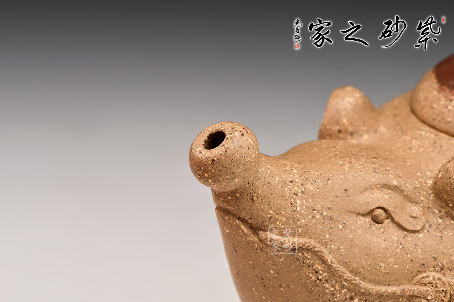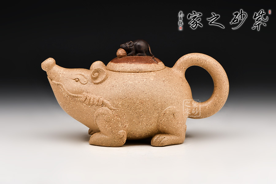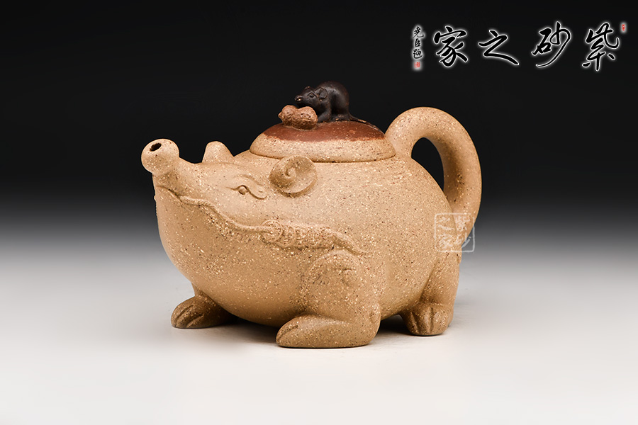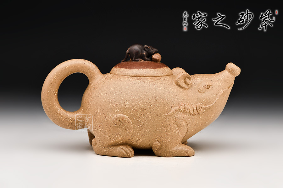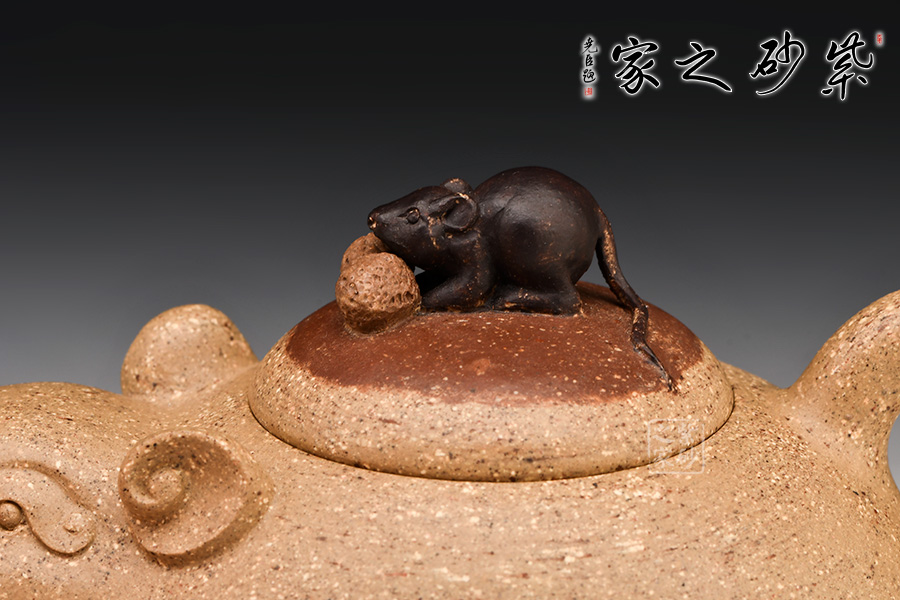 壺嘴制作成老鼠的頭部,尖尖的壺口是鼠嘴,配上小小的眼睛,還有圓滑的小耳朵。壺蓋上的滴子是只小老鼠,它乖巧地端坐在上面。小老鼠前面有一粒飽滿的花生。老鼠翹起來的小尾巴做成壺把,這樣我們拿起來沏茶就很方便。