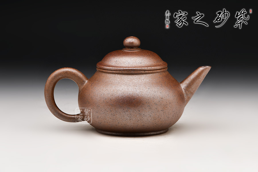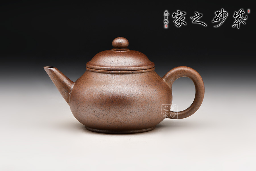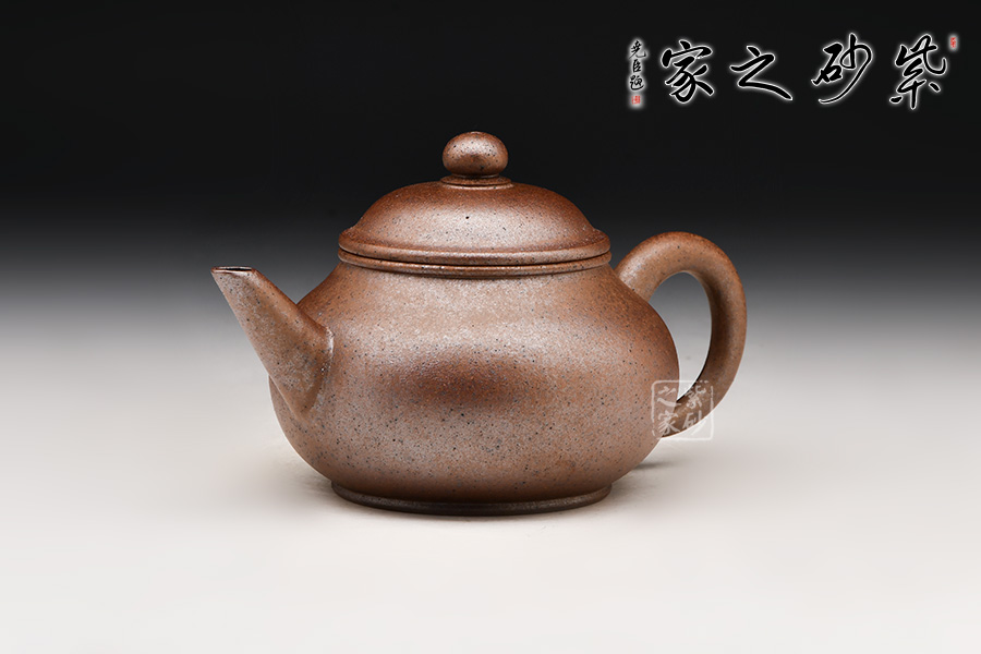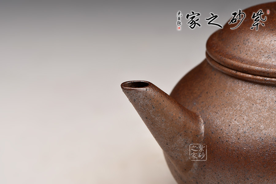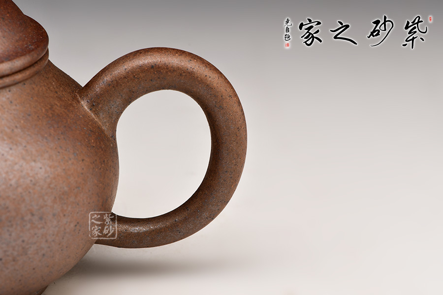 標(biāo)準(zhǔn)水平式,壺身圓潤飽滿,配以截直流,帶圈耳把,下加圈足,造型小巧可愛。窯變工藝,泥色神秘純正,兼具精巧與實(shí)用性。