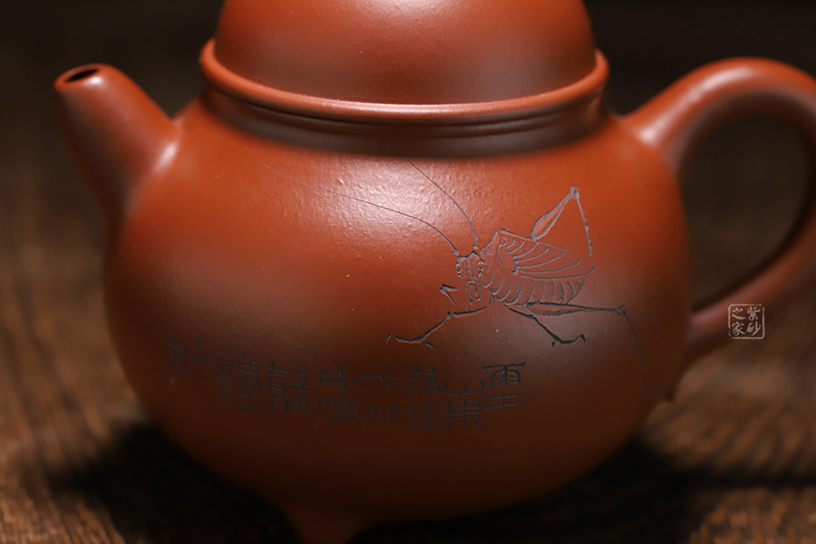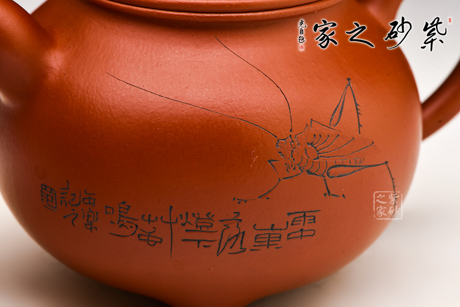 此壺乃經(jīng)典器型,線條流暢潤澤,略顯頎長的壺身十分秀雅,很是耐看。一彎流自然胥出,與壺把及壺鈕遙相呼應(yīng),協(xié)調(diào)不亂。壺蓋微鼓,子母線嚴(yán)絲密縫,圓珠鈕飽滿挺立。 此外,壺面雙面刻繪,正面一直紡織娘正在辛勤勞作;反面刻繪“游心”兩字。