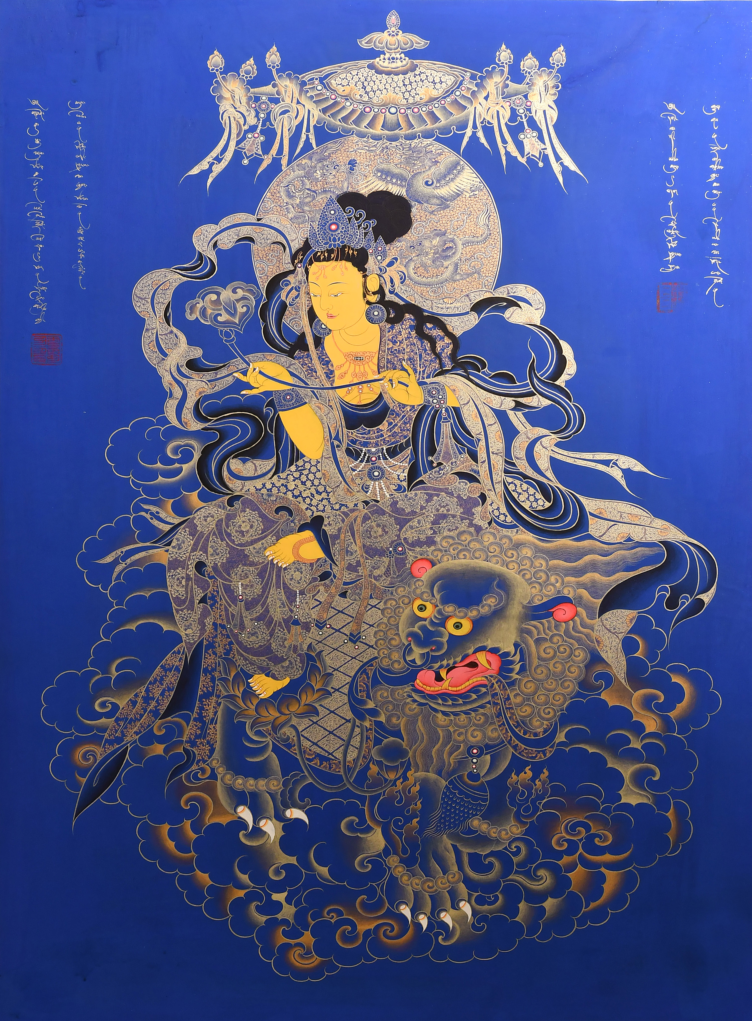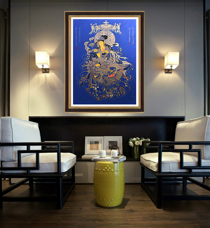 產(chǎn)地:熱貢 工藝:藍唐 創(chuàng)作年份:2020 題材:文殊菩薩 繪制時間:5月 尺寸:*70*100cm 裝裱: 材質:織面 使用場地:玄關