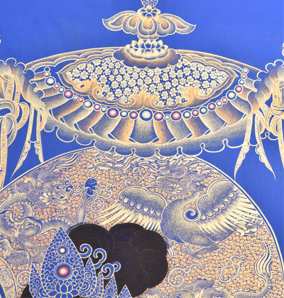 此作品為青海熱貢出家?guī)煾讣獯氪髱熓掷L而成,尺寸為100*70CM,藍唐。