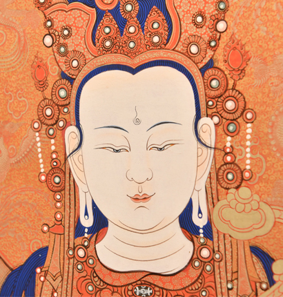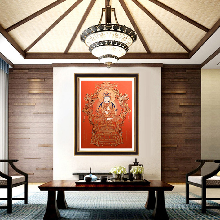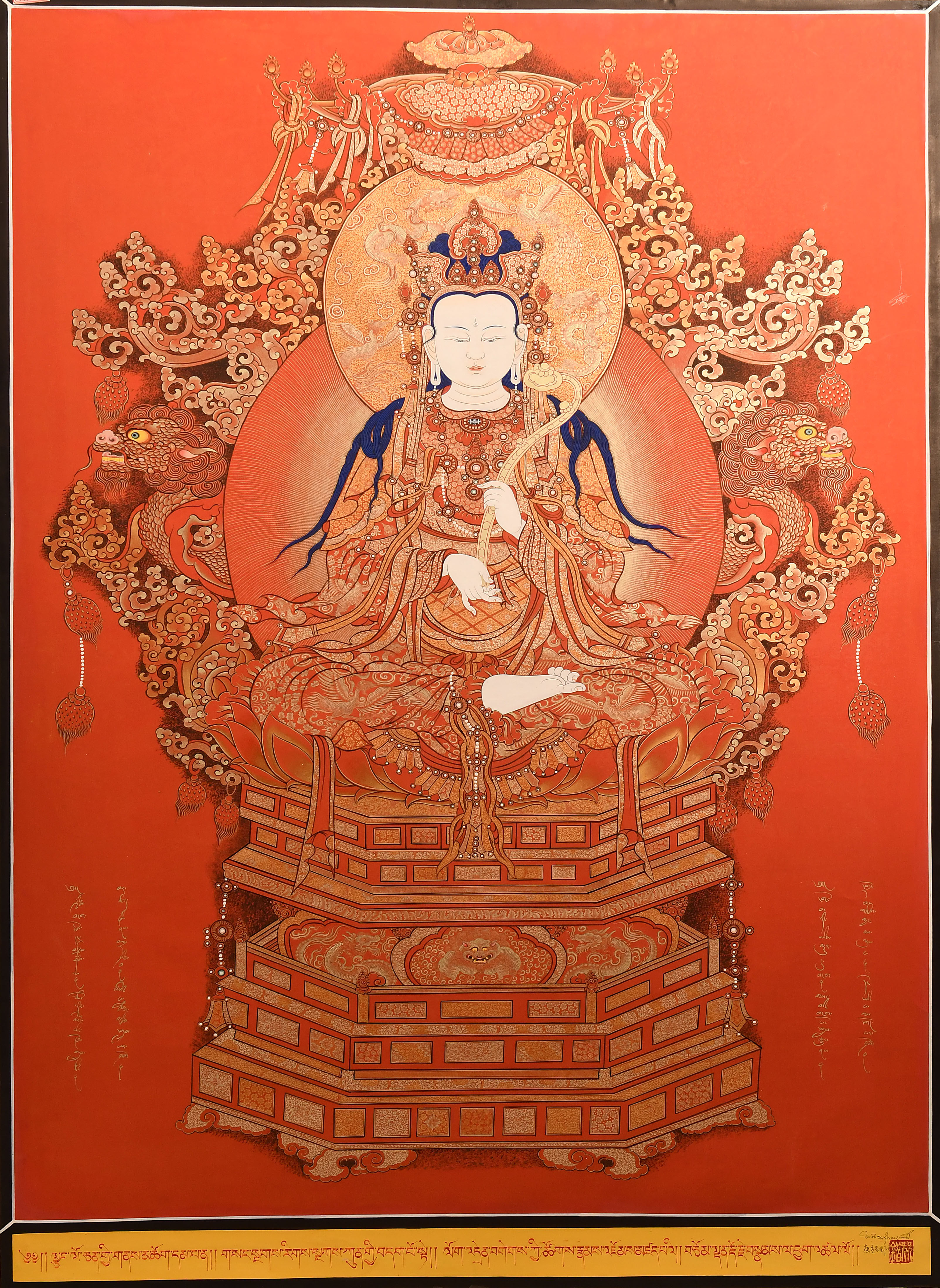 產(chǎn)地:熱貢 工藝:朱紅唐 創(chuàng)作年份:2020 題材:大勢至菩薩 繪制時間:6月 尺寸:*70*100cm 裝裱: 材質(zhì):織面 使用場地:書房