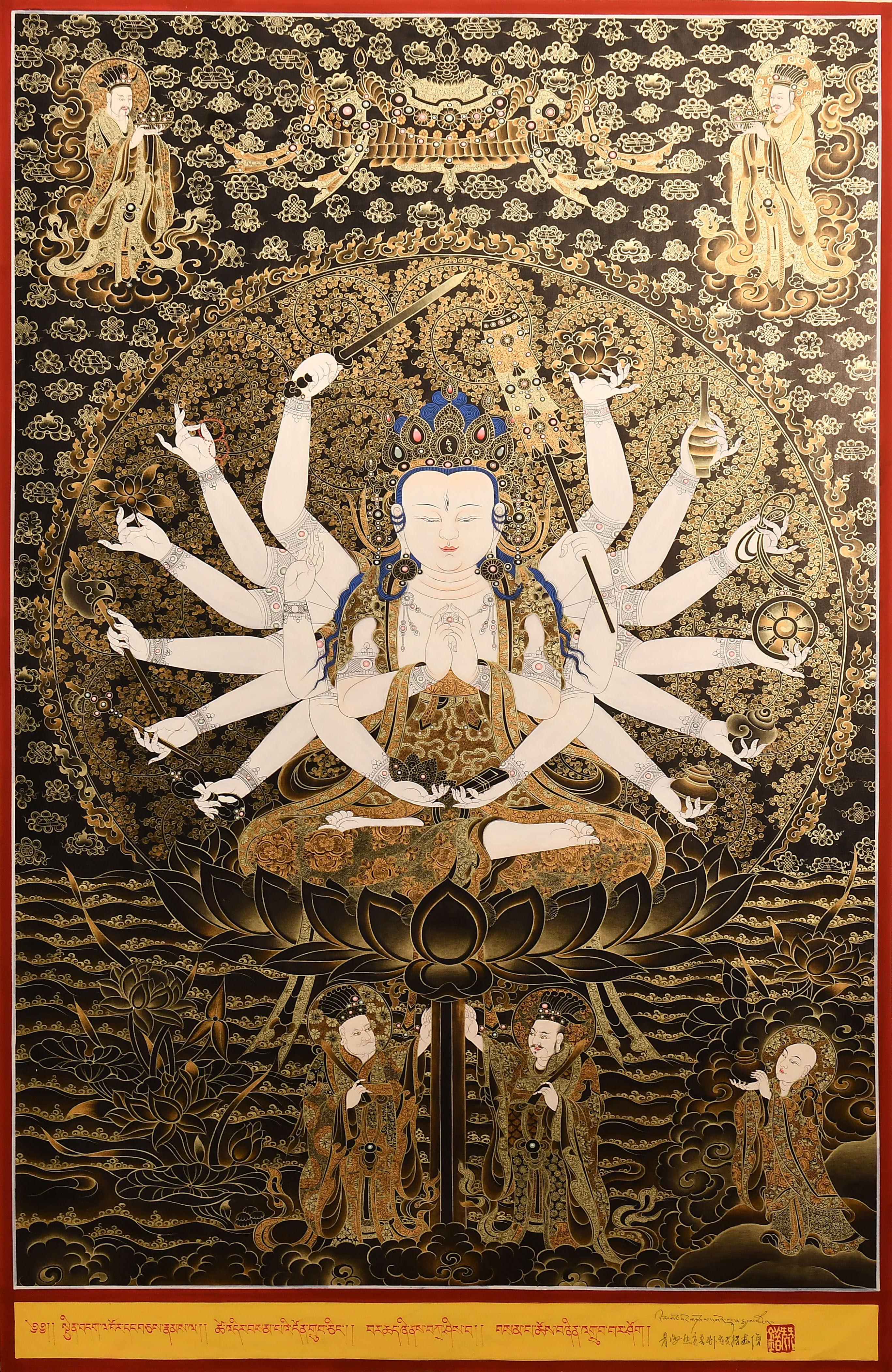 此作品為青海熱貢出家師父尖措大師手繪而成,尺寸為100*70CM,黑金。