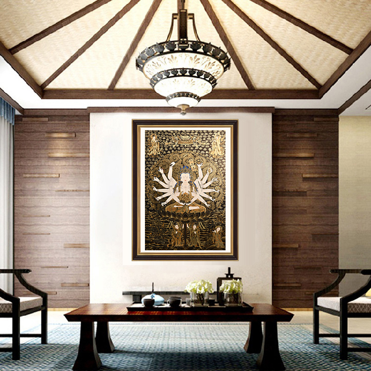 產地:熱貢 工藝:黑金 創作年份:2020 題材:準提佛母 繪制時間:5月 尺寸:*70*100cm 裝裱: 材質:織面 使用場地:客廳
