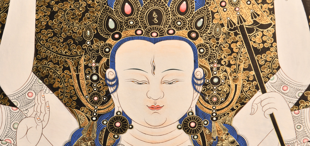 | 唐卡“師傅”開臉,筆路穩重流暢。體現完美天人相,可見佛菩薩慈眉善目,賦予唐卡畫像生的靈氣。 | 細節決定品質,點睛之筆不到位影響整體美觀,五官比例不協調,面目呆板,缺乏靈氣。 |