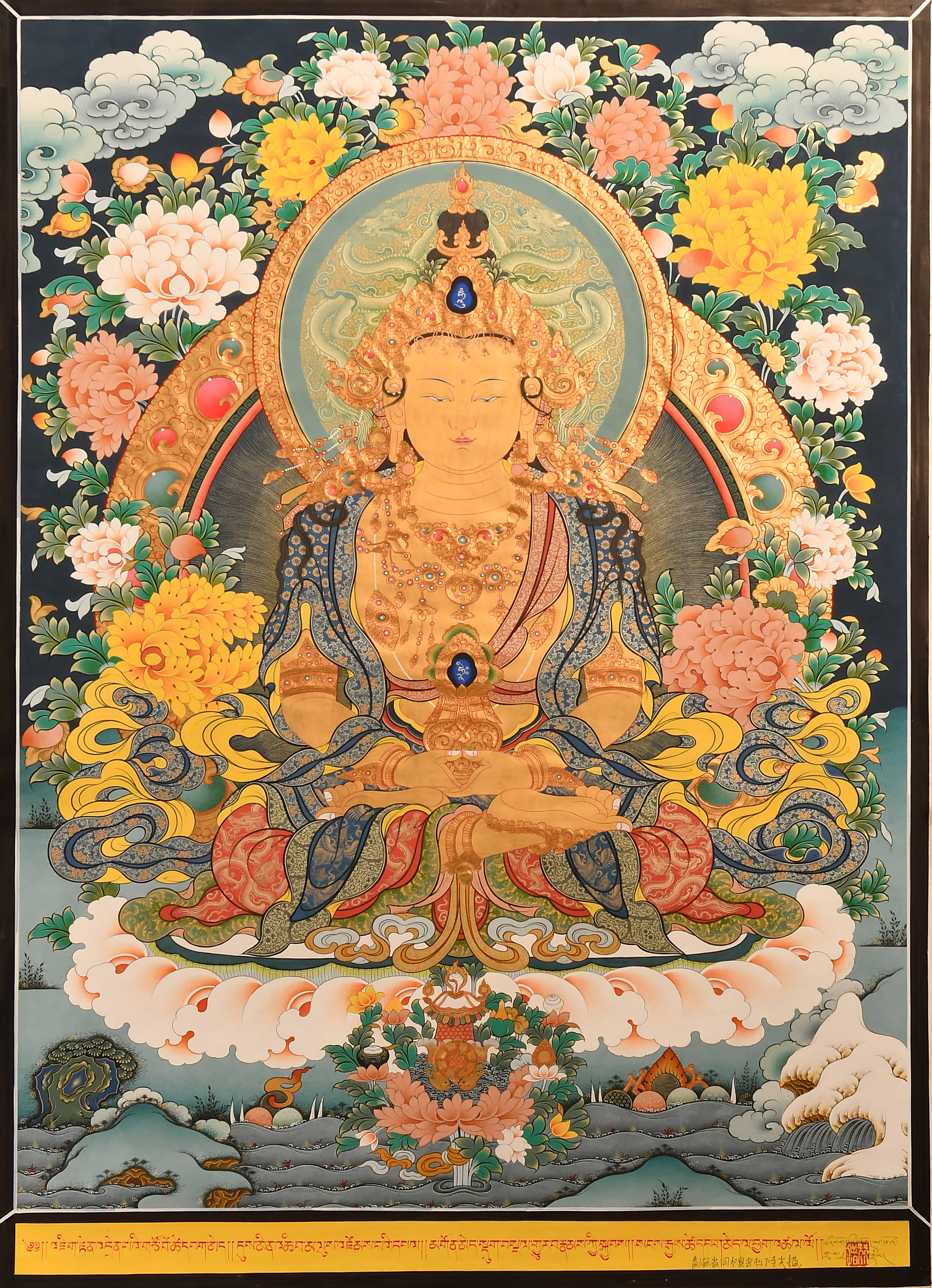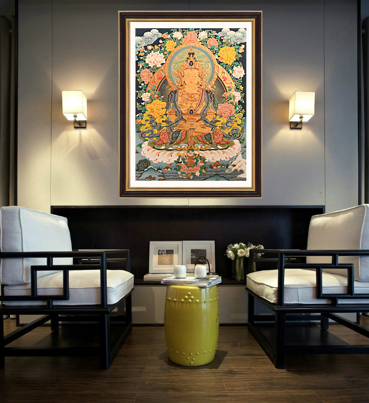 產(chǎn)地:熱貢 工藝:彩唐 創(chuàng)作年份:2020 題材:長壽佛 繪制時(shí)間:8月 尺寸:*70*100cm 裝裱: 材質(zhì):織面 使用場地:客廳