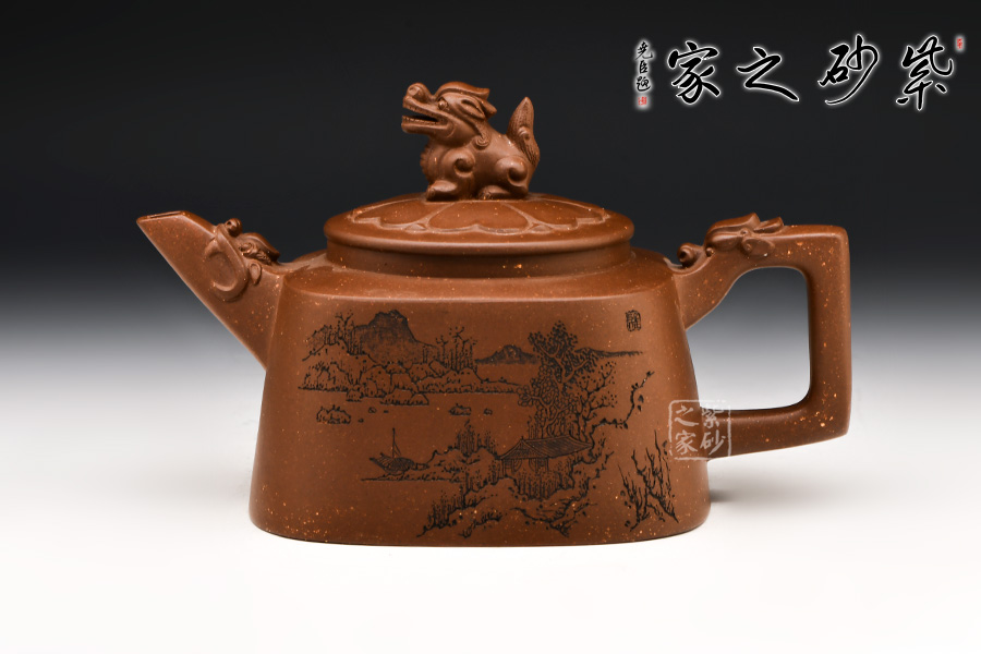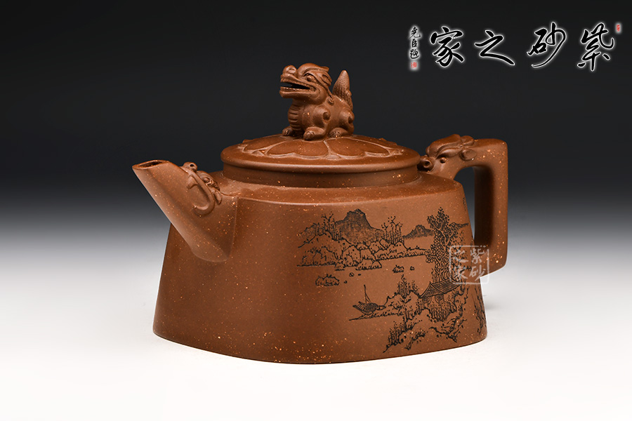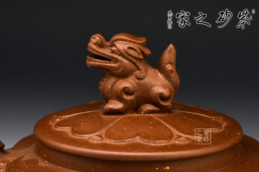 流把同樣以四方之形設(shè)計(jì),皆以“龍吐水”之形呈現(xiàn),彰顯肅穆之氣勢(shì)。圓形壺蓋之上以瑞獸設(shè)計(jì),精巧靈動(dòng),象征吉祥,有祥瑞之氣。整體造型與紋樣,和諧統(tǒng)一,樸雅敦厚。