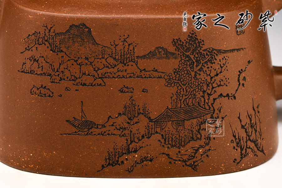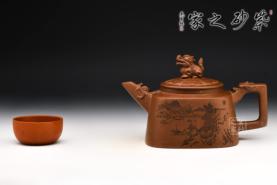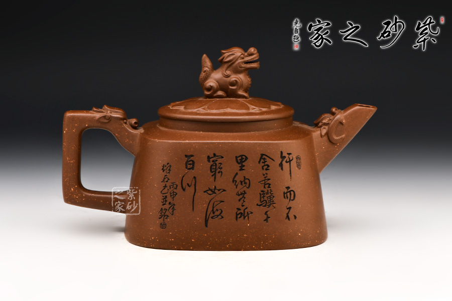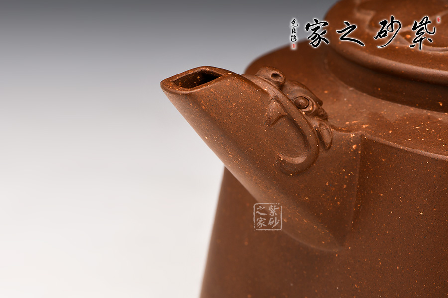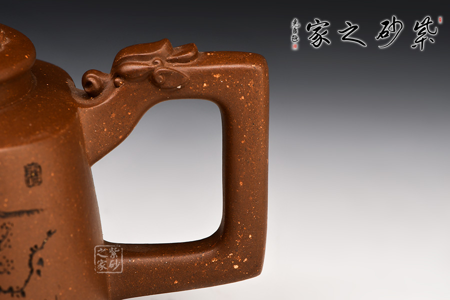 此壺以方器為基調(diào),壺體四方,方中寓圓。壺腹以梯形狀示出,秀出壺身俊逸周正之姿,烘托出壺體剛健之態(tài)。