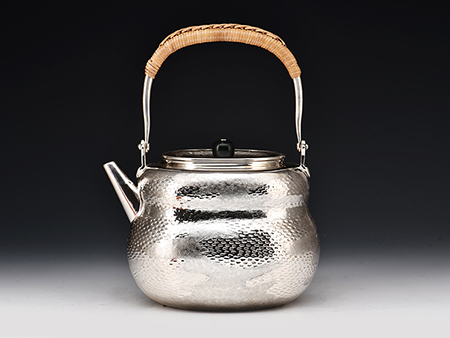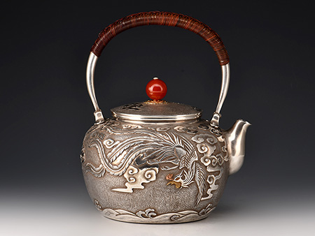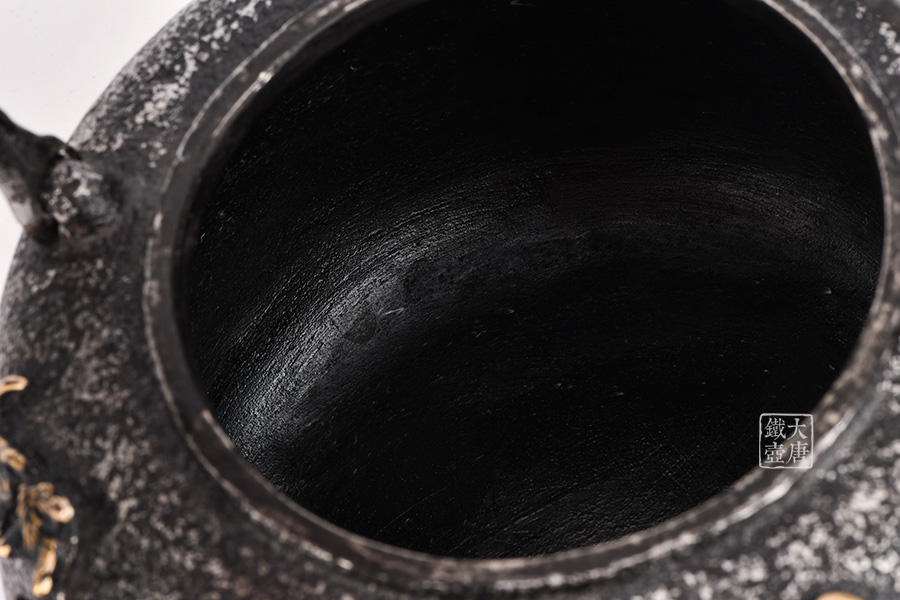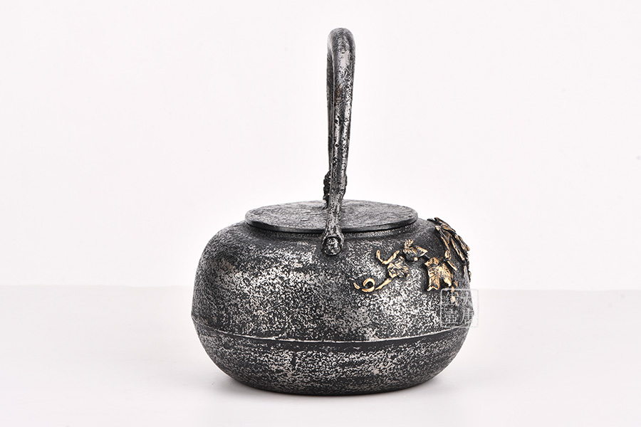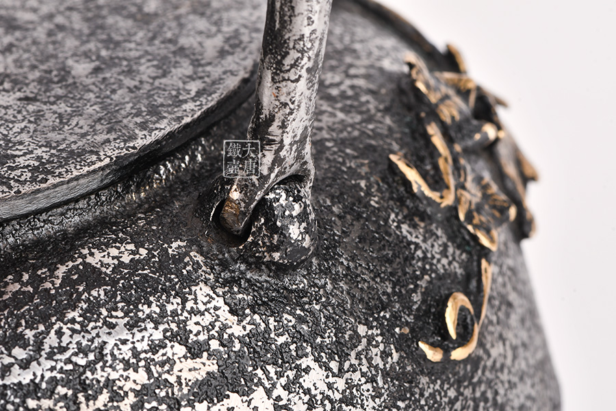 荒井工房的鐵瓶除了在鑄造工藝上有嚴(yán)格的規(guī)范和體系,在鐵瓶裝飾技術(shù)上也頗有建樹。除了傳統(tǒng)的印刻技術(shù)外,荒井工房還掌握了非常出色的金銀鑲嵌技藝,尤其以大片的鏨刻銀片最為出眾,這在山形當(dāng)?shù)靥每谥歇?dú)樹一幟。