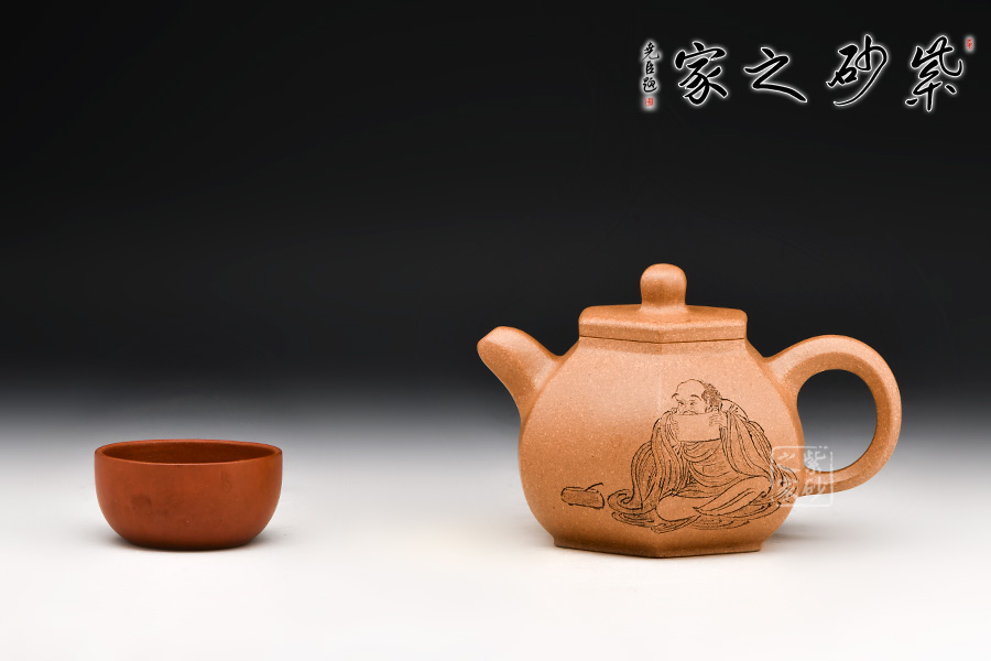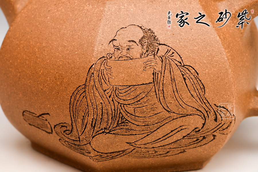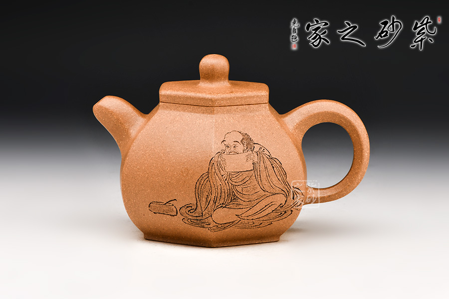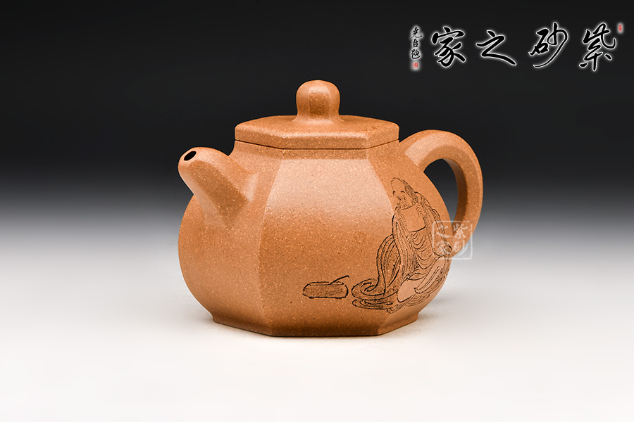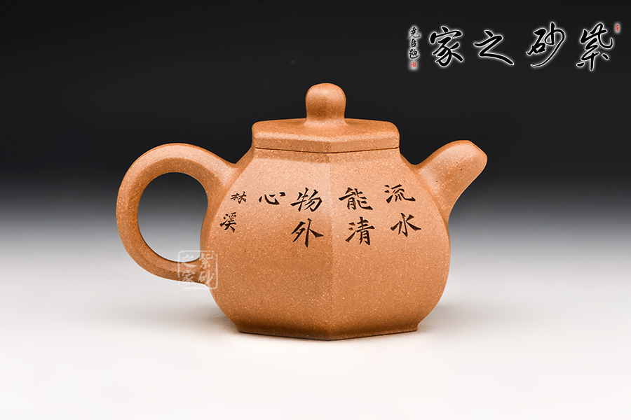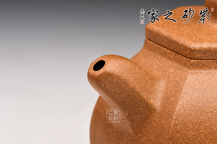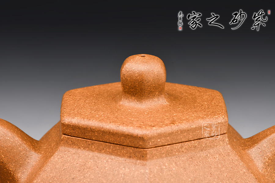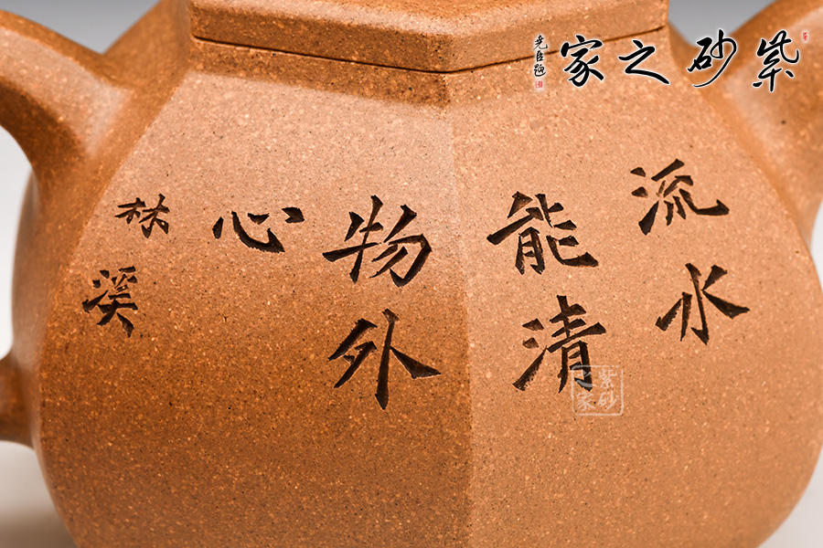 壺身呈六棱柱形,壺蓋與壺口相對(duì)亦呈六方圓形,六方形的小圓鈕,壺流與壺把同樣呈六棱形。各部位與形體相稱(chēng),古樸穩(wěn)重,整體線面挺括平整,線條剛?cè)嵯酀?jì)極具張力,形神俱佳。