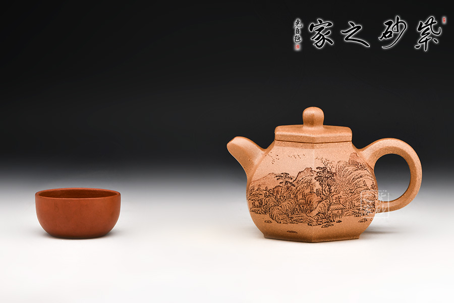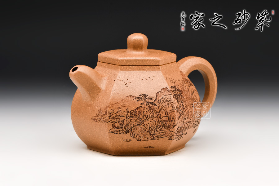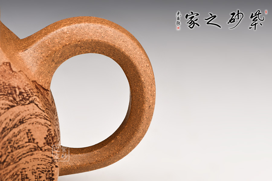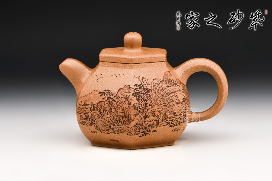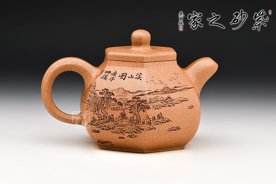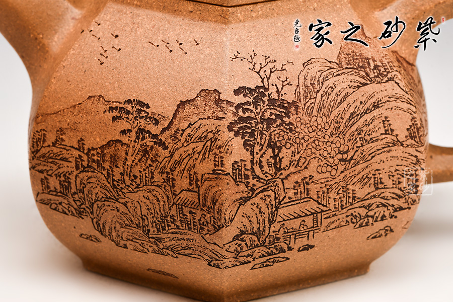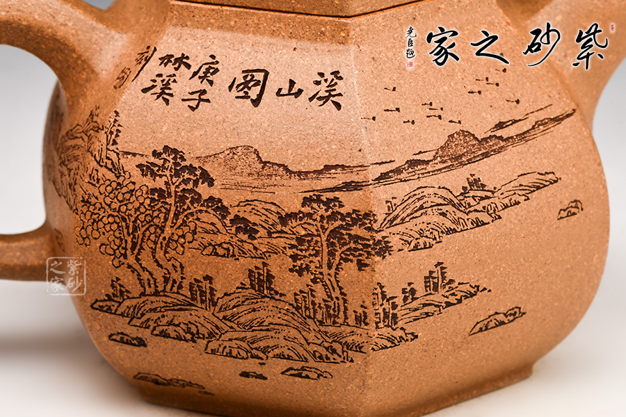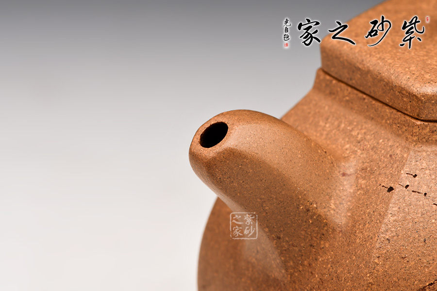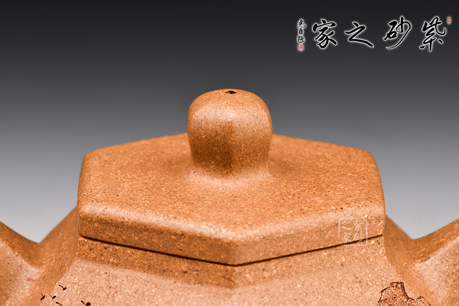 壺身呈六棱柱形,壺蓋與壺口相對(duì)亦呈六方圓形,六方形的小圓鈕,壺流與壺把同樣呈六棱形。各部位與形體相稱,古樸穩(wěn)重,整體線面挺括平整,線條剛?cè)嵯酀?jì)極具張力,形神俱佳。