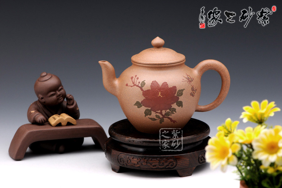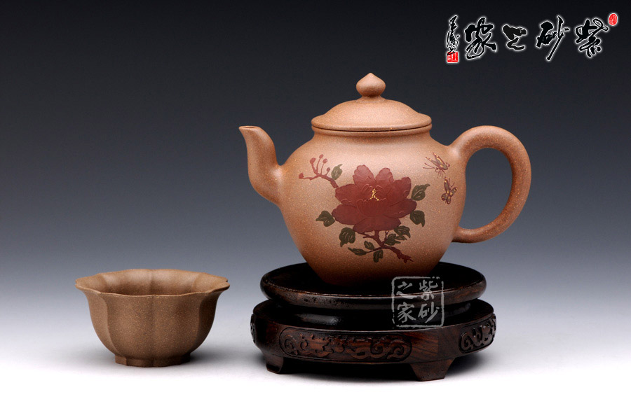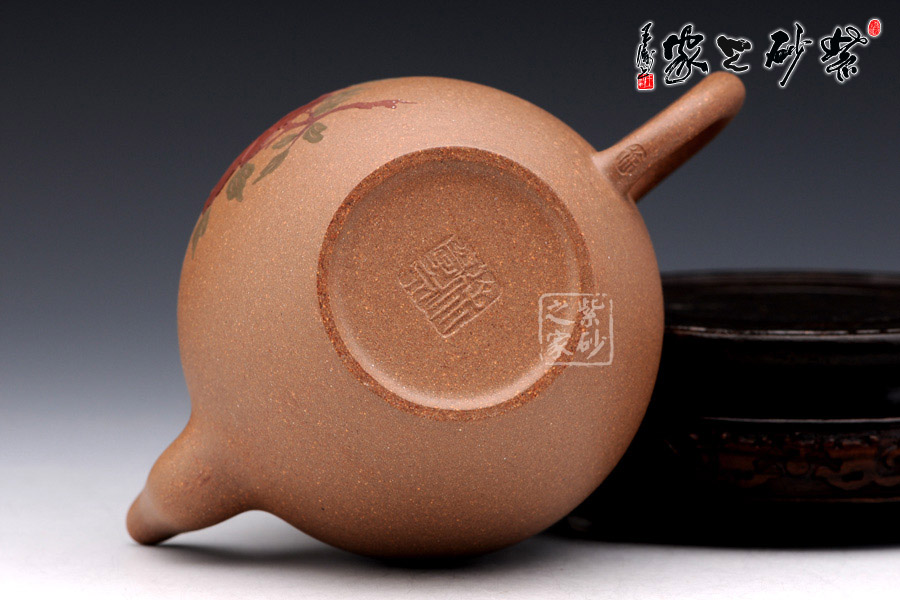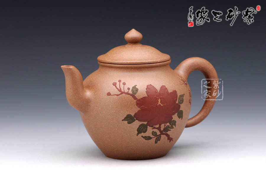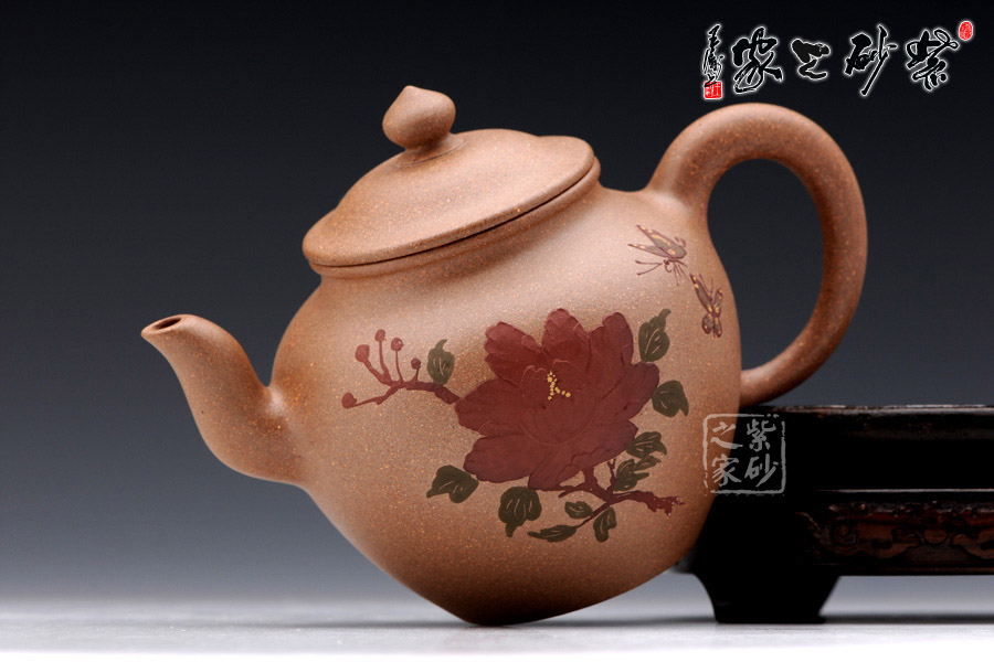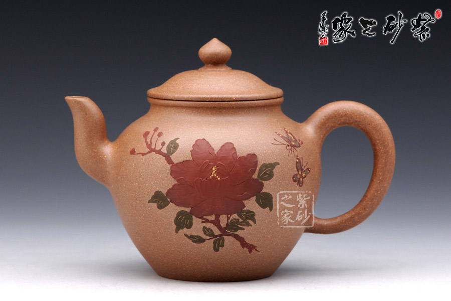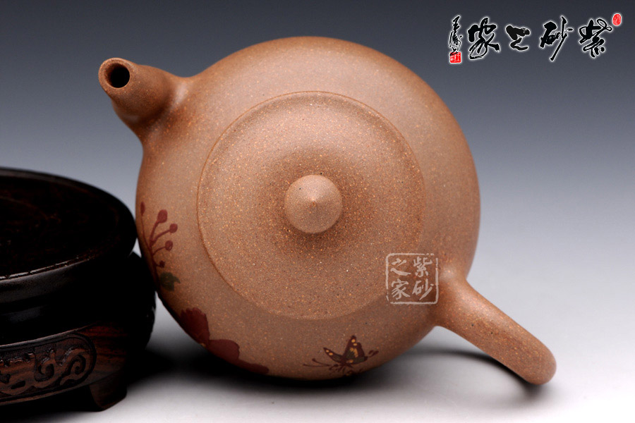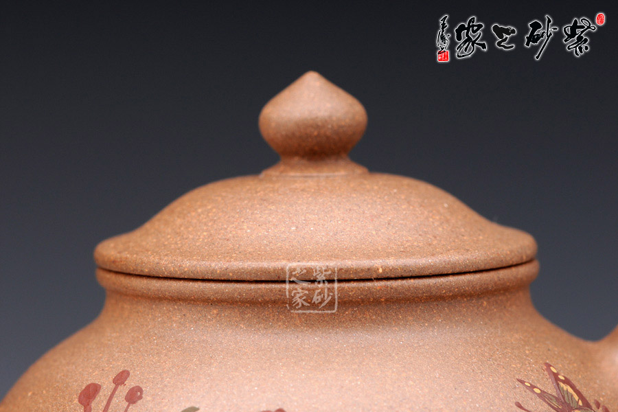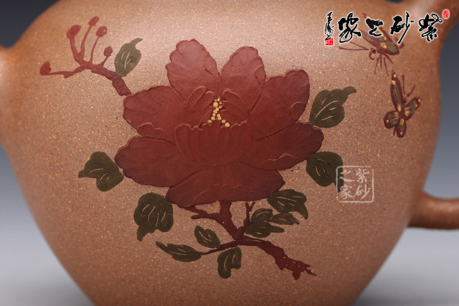 此壺采用泥繪手法在壺身正面有蝶戲牡丹,一朵碩大的牡丹在壺身正面,兩只彩蝶縈繞其中,姿態(tài)蹁躚,搖曳萬(wàn)千,情態(tài)優(yōu)美,值得藏用!