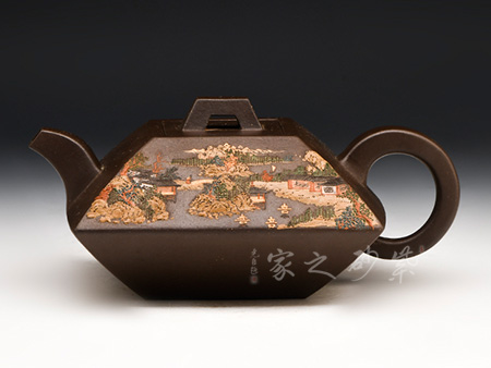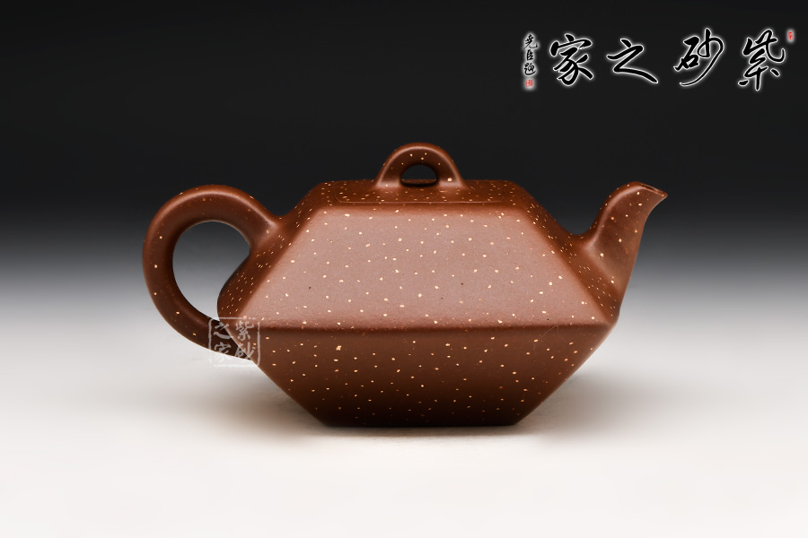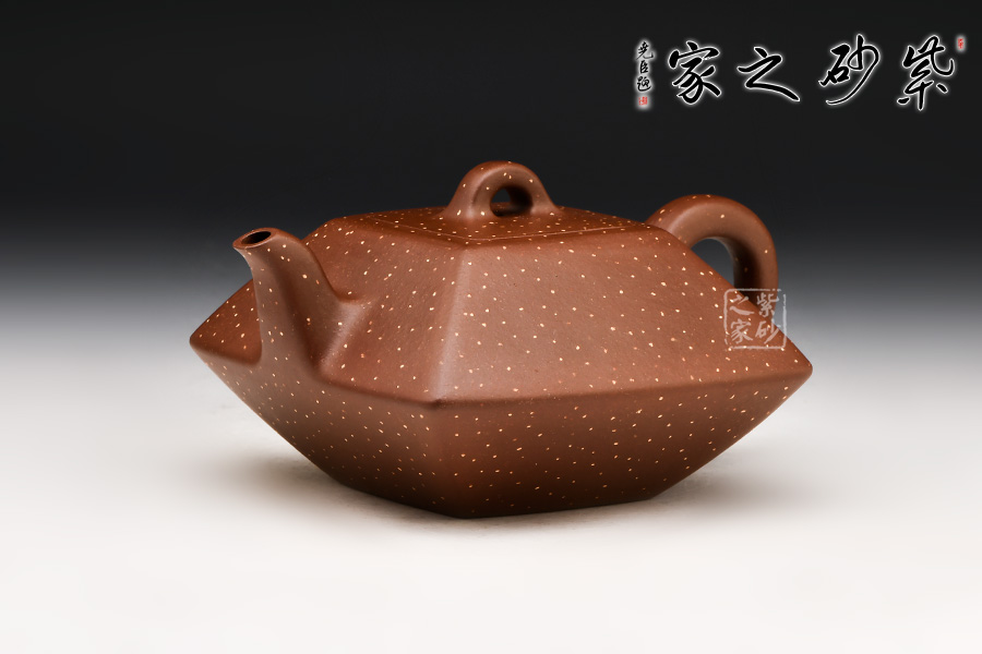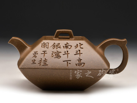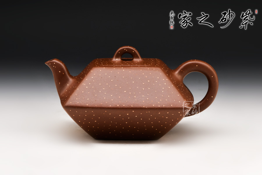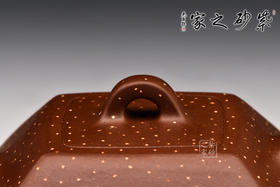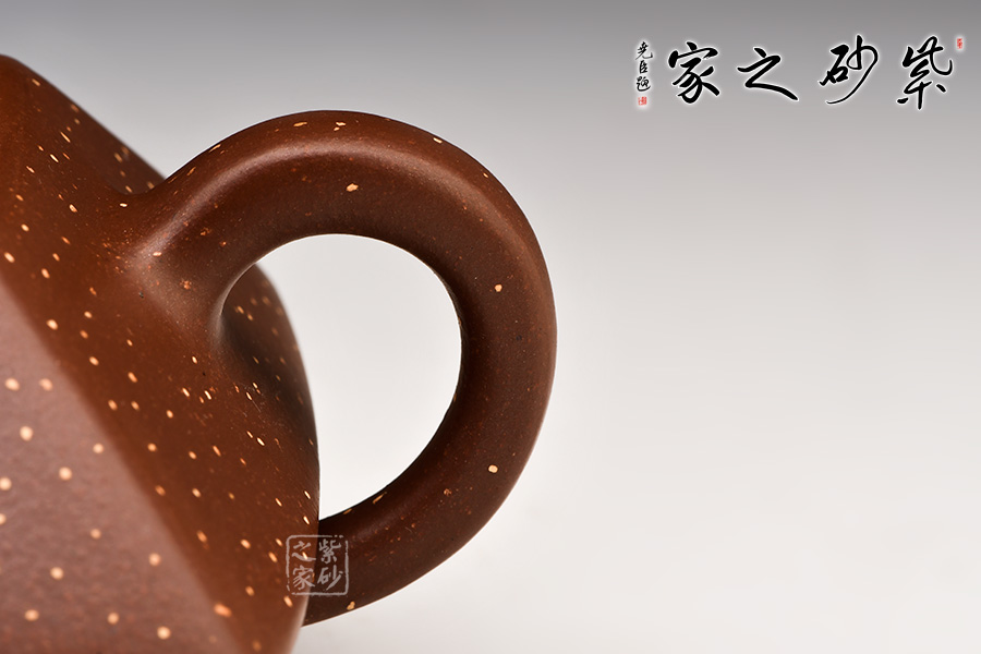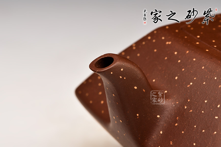 此壺棱角分明,方正可鑒,四平八穩(wěn),通身鋪砂“金光”點(diǎn)飾,告誡世人為人處事須剛正方直,智欲圓而行欲方,寓形寓意,聚天地之靈氣,乃智慧之壺。