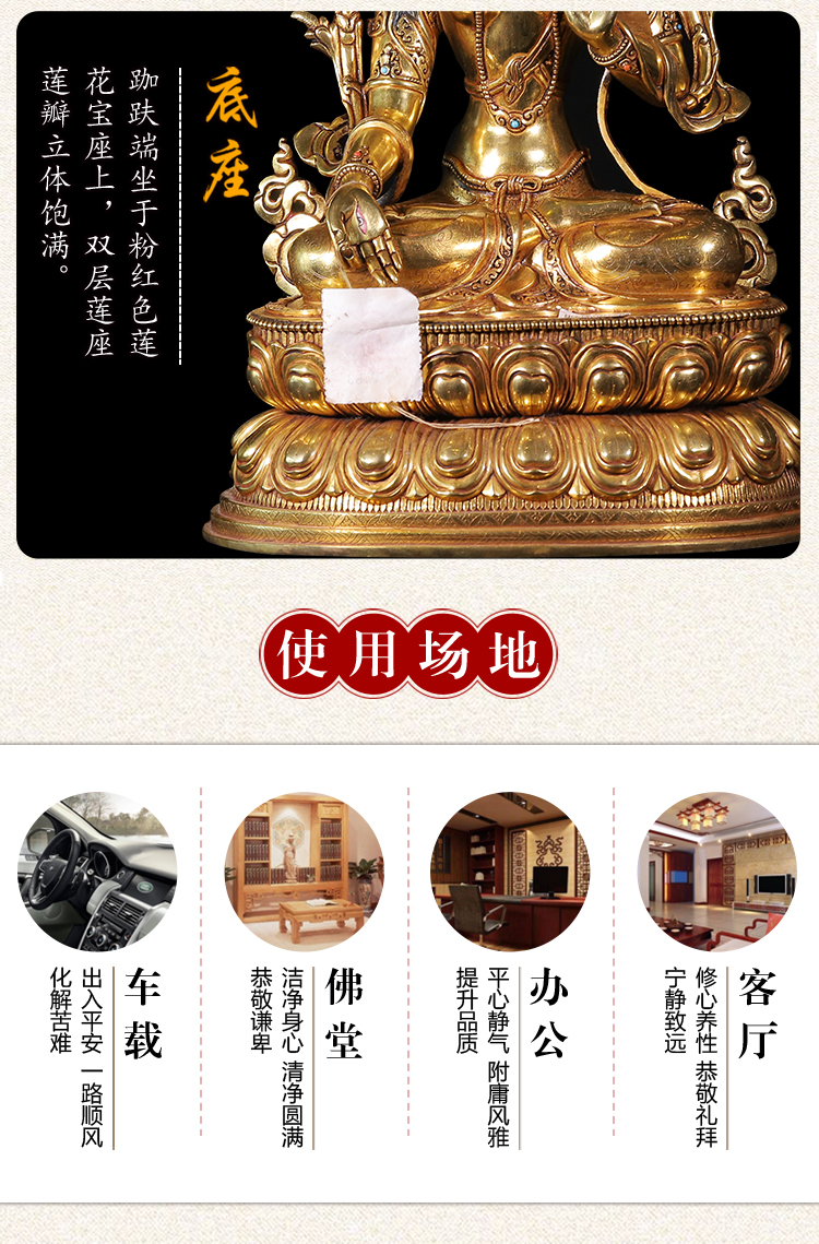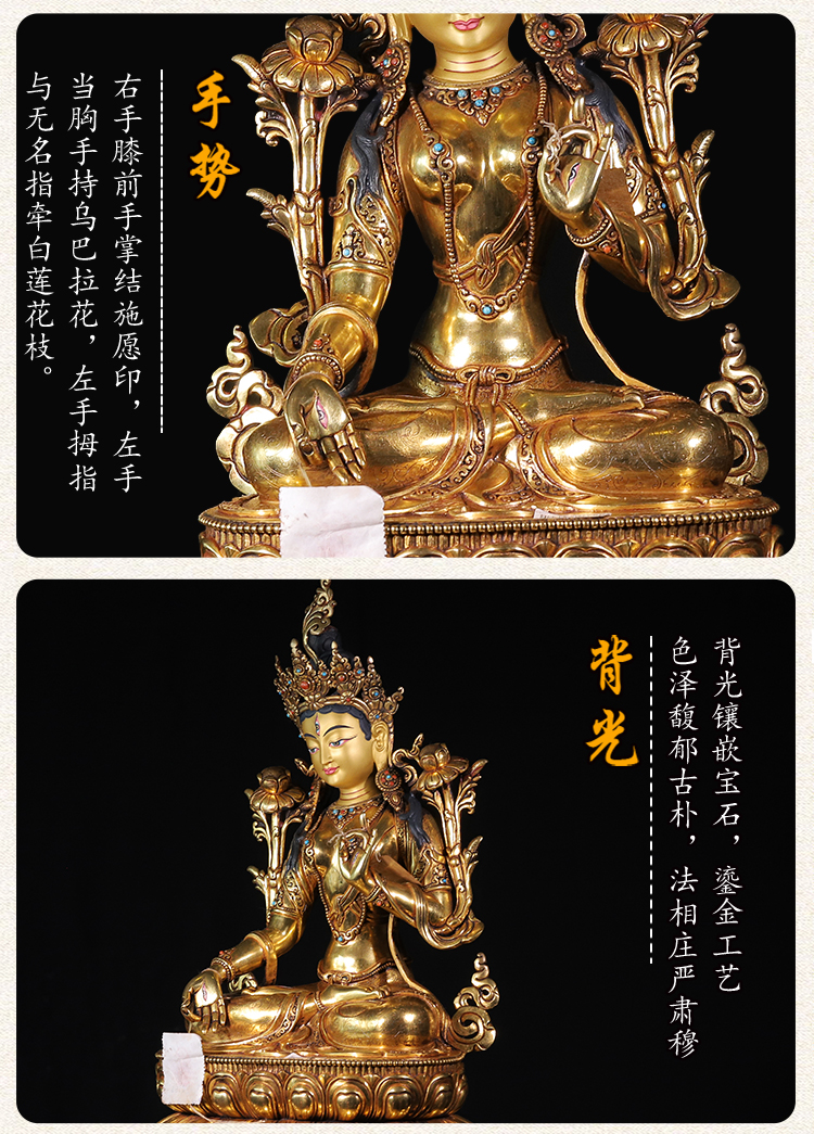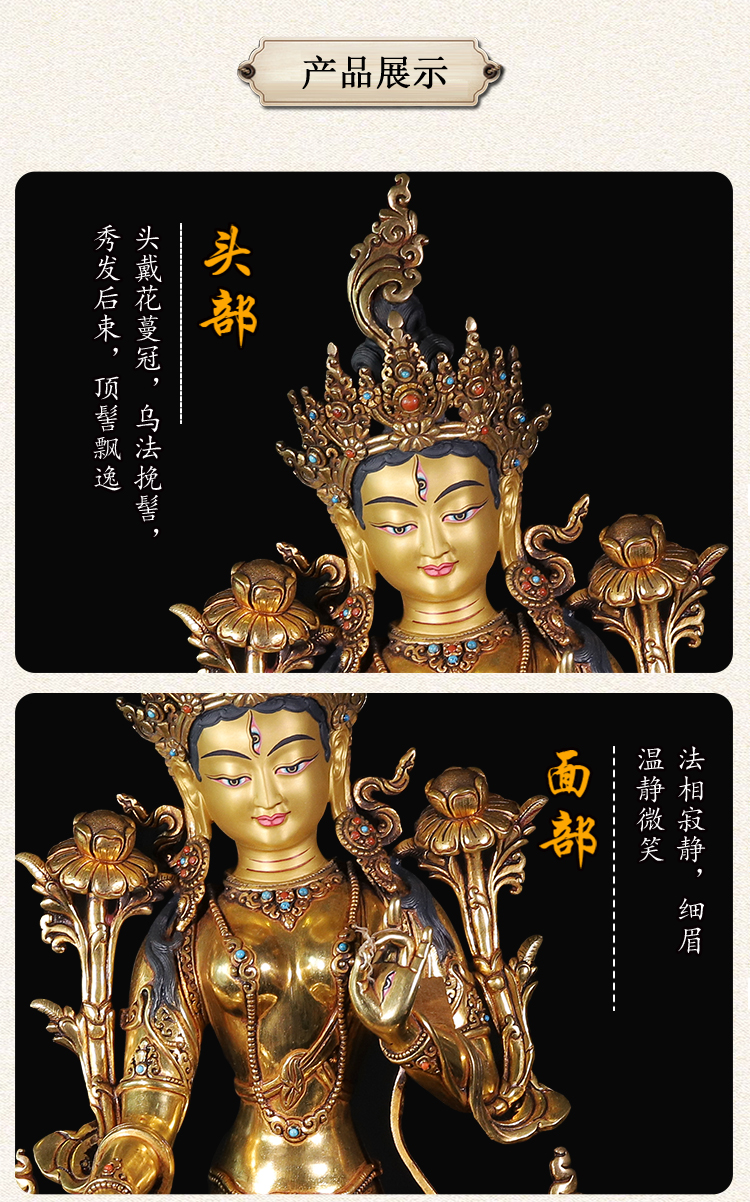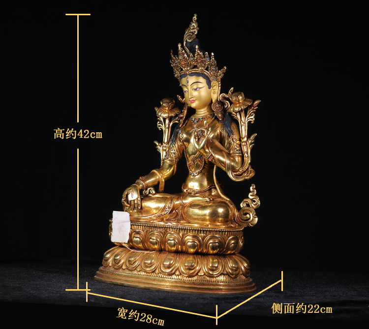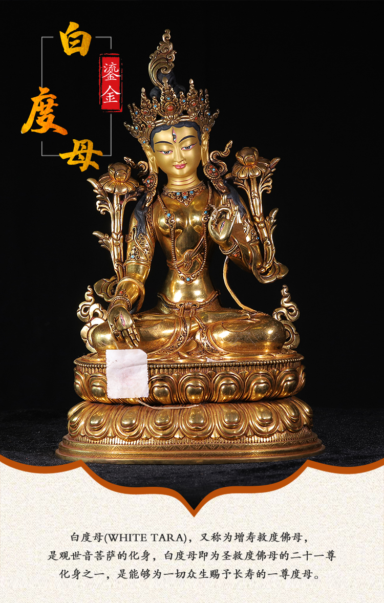 產地:尼泊爾佛像 工藝:鎏金 創作年份:2020 題材:白度母 繪制時間:0日 尺寸:22*28*42cm 重量:0 g 材質:紫銅 使用場地: