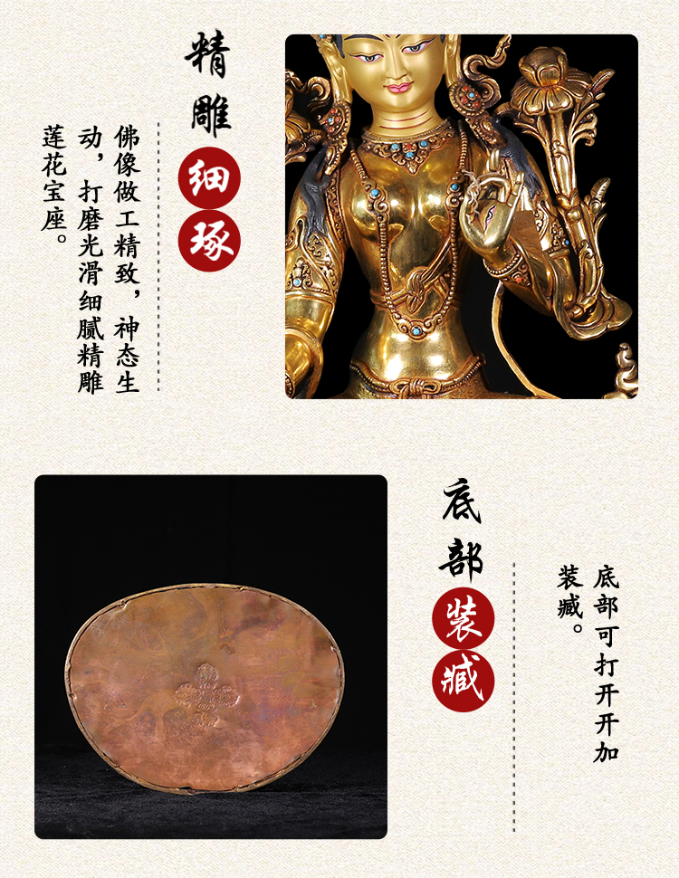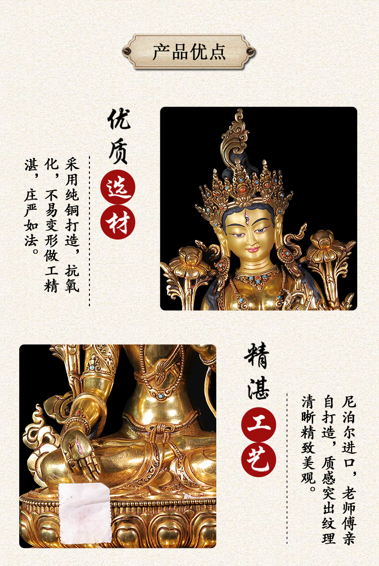 尼泊爾佛像也稱之為密宗佛像或藏傳佛像,尼泊爾佛像是以紫銅為胎體,黃金為外衣,純手工打造的銅鎏金佛像,使用泥金進行開臉,異常殊勝所以尼泊爾佛像價格比國內機器佛像普遍要高一些!