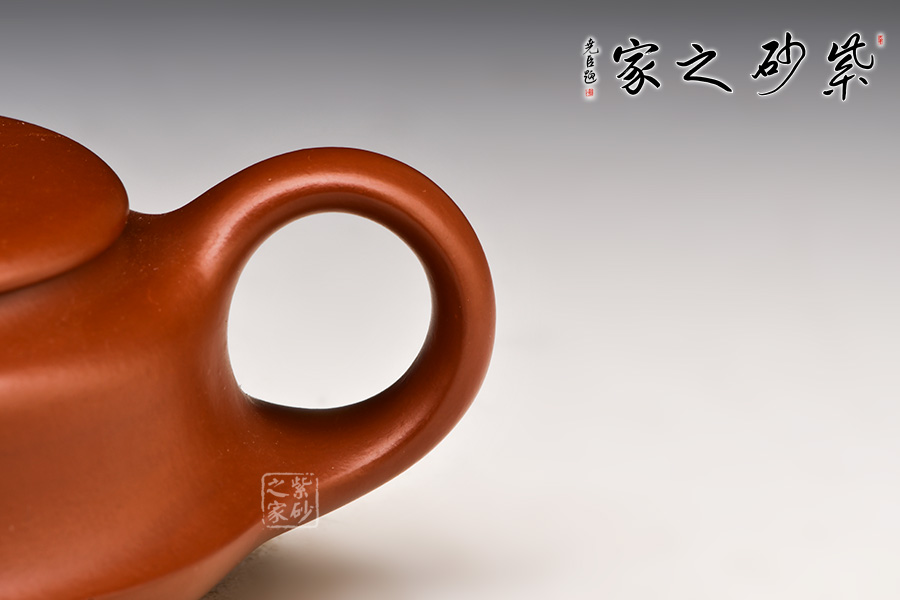 吳力群老師手工制壺,精選極品朱泥大紅袍制作而成。此壺質(zhì)感綿密,色澤艷麗,緊實(shí)細(xì)致。由精簡(jiǎn)的線面構(gòu)成,壺身向內(nèi),形成前后光潔凹面;壺嘴朝天,短而粗大,出水爽利;壺把從壺身而出,形成一個(gè)漂亮的封閉圓形;壺蓋與壺身緊密貼合,壺鈕小巧精致。