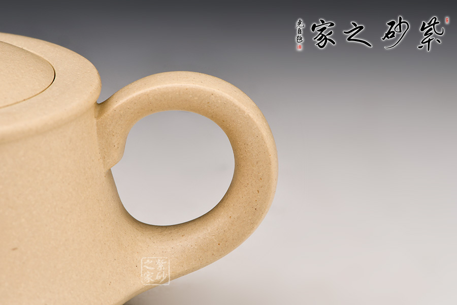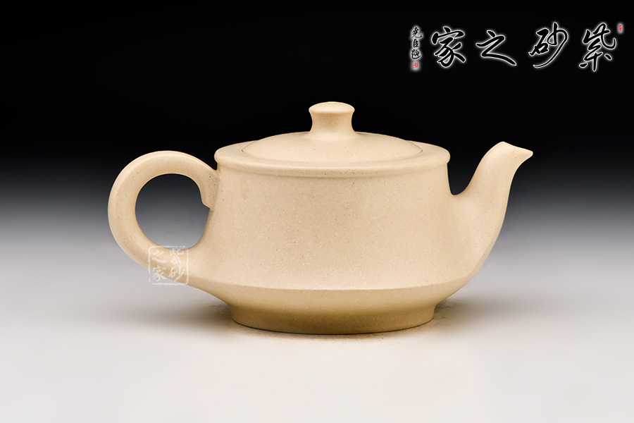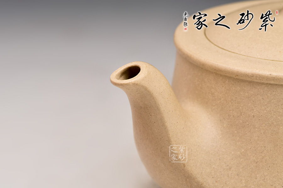 曲壺選用白段制作,做工細致,色澤白皙,質(zhì)地純粹。整款壺為柱形,上窄下寬,壺底如同一個盤子與壺身相接而成,壺身向內(nèi)凹陷,力蘊十足。同時,一彎嘴扁平而修長,出水如柱。嘴口朝天,嘴上側(cè)為弧面,造型別致。壺把呈倒耳形,拿捏方便。圓鈕,壓蓋,氣密性極好。