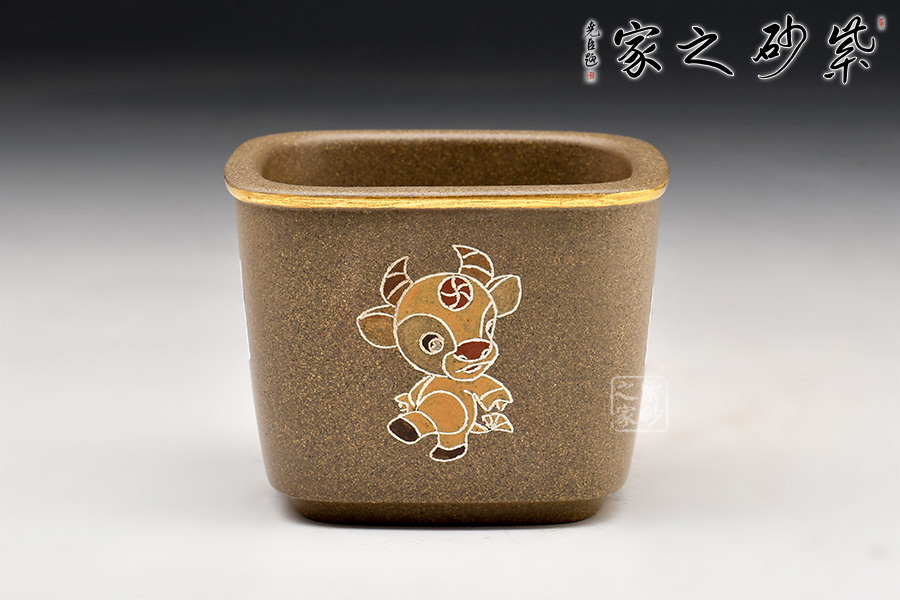 丁小明老師制作的十二生肖主人杯,此為生肖“?!?。杯身呈四方,棱線柔和,觀之舒心,握之舒適。杯身正面繪刻的彩色小牛形象小巧可愛,憨態(tài)可掬,讓人心生喜意。