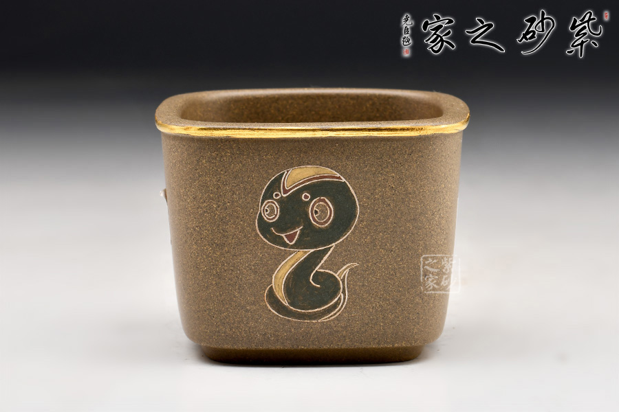 丁小明老師制作的十二生肖主人杯,此為生肖“蛇”。杯身呈四方,棱線柔和,觀之舒心,握之舒適。杯身正面繪刻的彩色小蛇形象小巧可愛,憨態(tài)可掬,讓人心生喜意。