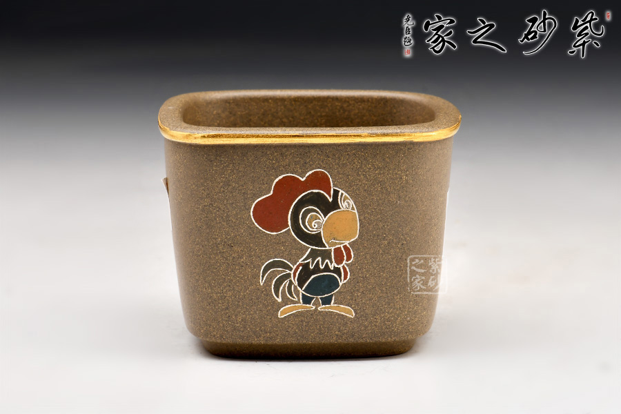 丁小明老師制作的十二生肖主人杯,此為生肖“雞”。杯身呈四方,棱線柔和,觀之舒心,握之舒適。杯身正面繪刻的彩色小雞形象小巧可愛,憨態(tài)可掬,讓人心生喜意。