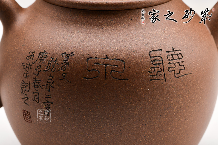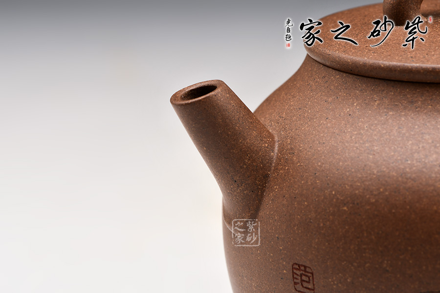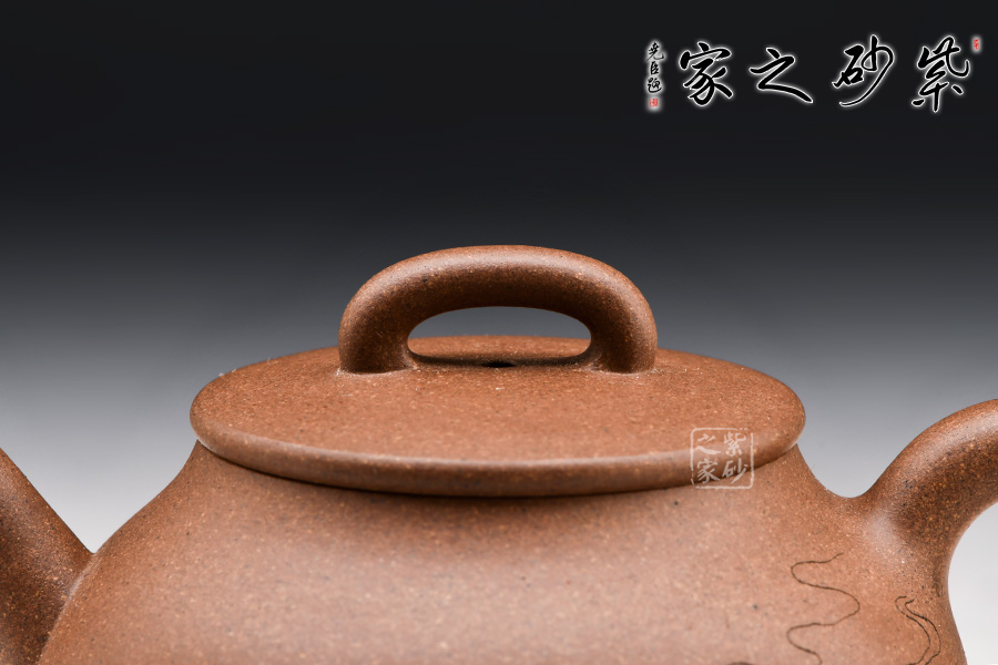 此壺,壺形上小下大,重心下垂,沉穩(wěn)敦實。壺身設短直流,率直有力,出水流暢,后設耳形壺鋬,曲直得當,壺流、壺口、壺把三點形成水平直線,更顯端莊敦穆,沉穩(wěn)含蓄。壺身上設圓蓋,鈕作連橋。壺身采用上佳細膩天青泥制作,砂質(zhì)均勻平滑,色澤沉郁清亮,構(gòu)思奇寓。