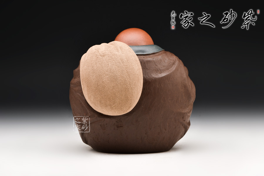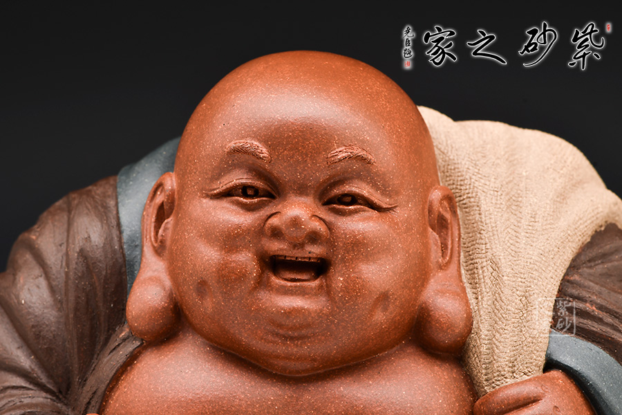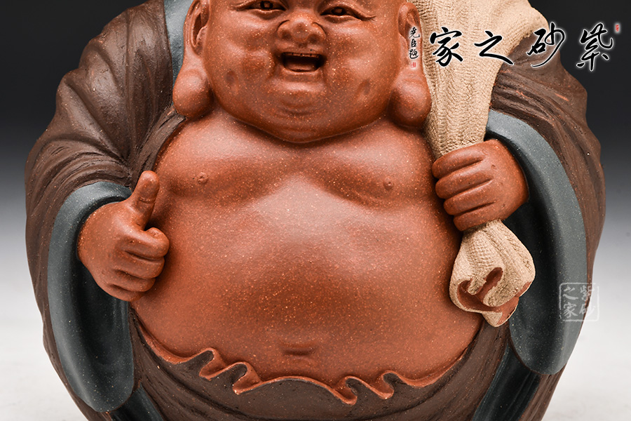 此款紫砂布袋和尚像,袒胸露懷,寬衣大肚,整體刻劃得極為生動(dòng)。史小明以非常生活化、戲劇化的眼光塑造了身著寬大僧袍、豎起拇指、肩背布袋、喜眉笑眼的彌勒佛形象。彌勒的表情形神兼?zhèn)洌录y和布袋簡(jiǎn)勁流利,用線一氣呵成,簡(jiǎn)括而不草率,將彌勒佛逍遙自在、大肚能容的形象表現(xiàn)得極為到位。史小明借助他獨(dú)特的紫砂藝術(shù)語(yǔ)言,在技藝和寫(xiě)意之間取得最佳平衡,創(chuàng)作出這樣一個(gè)逍遙放曠的布袋和尚形象,可謂獨(dú)抒性靈、不拘格套。