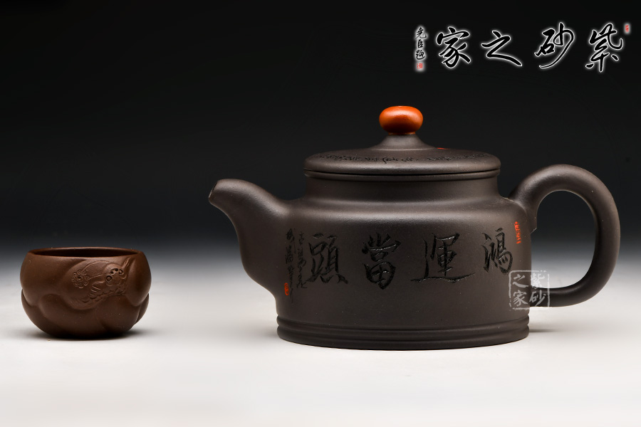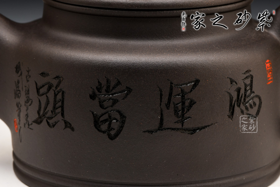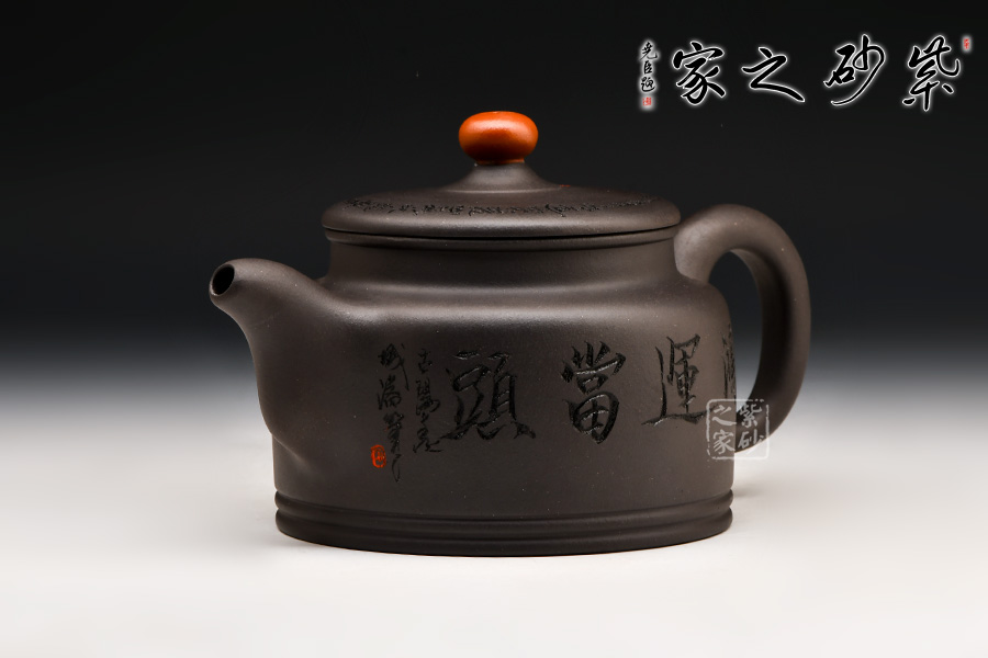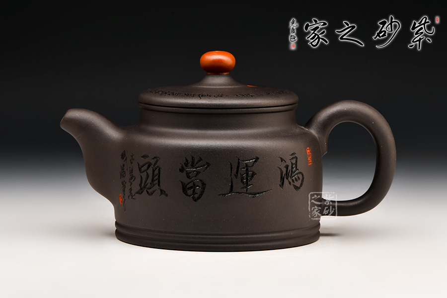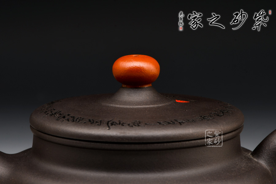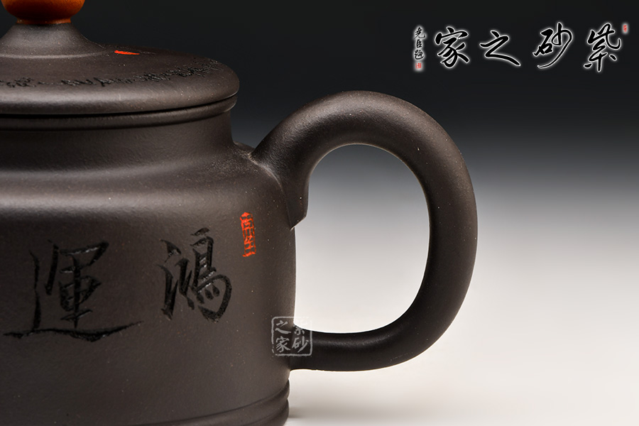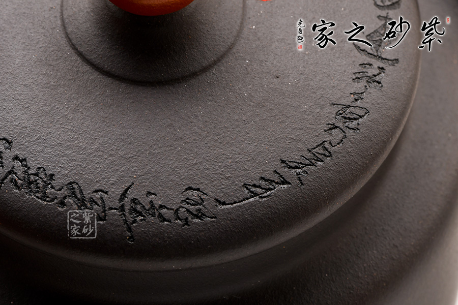 整壺圓柱形,坡肩過渡順滑,短頸與壺身呼應,壺口一圈口沿,平蓋平整,子母線吻合嚴密。壺鈕是圓珠鈕,呈紅色,取意鴻運當頭。