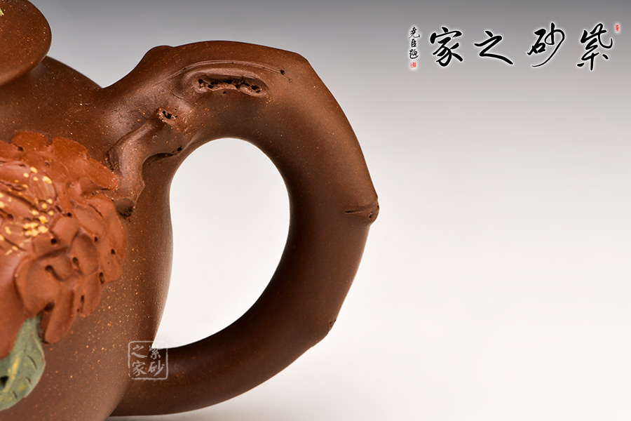 《花開富貴》,寓意美好,主題鮮明?;ㄆ髟煨停Y(jié)合堆貼花、雙色泥與泥繪裝飾技法,使得整把壺既富于“技”的演繹,亦因此得以“道”的升華。