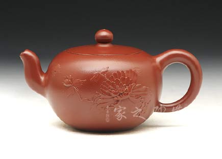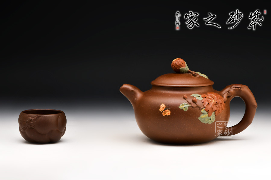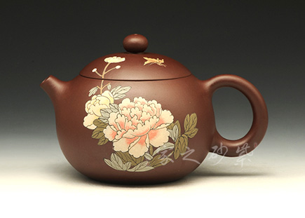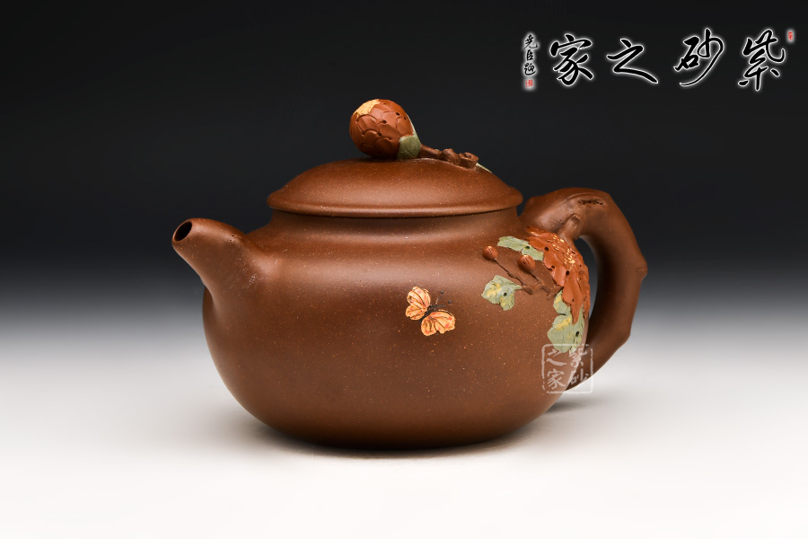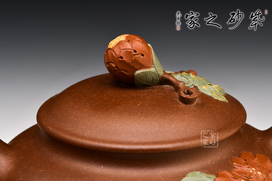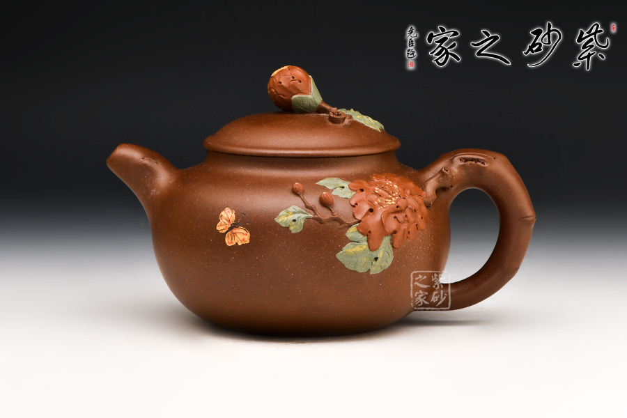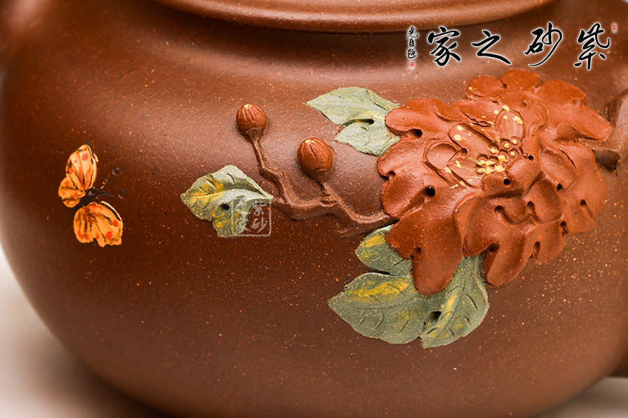 紫泥質(zhì)材華而不艷,壺身渾圓雅致,飽滿豐腴。壺嘴、把如帶節(jié)的牡丹花枝,生動(dòng)逼真。壺蓋扣于口,壺肩與壺底短而穩(wěn),比例協(xié)調(diào),更凸顯整體形態(tài)的張力感。壺面上是一幅類似于浮雕的牡丹盛開圖,一朵紅牡丹貼在壺身,花瓣層次分明,優(yōu)雅大方,金絲般的花蕊鮮活細(xì)膩,紅花配綠葉,更顯紅欲溢、綠欲滴??催@壺中牡丹,美艷富麗,仿佛散發(fā)著似淡非濃的芬芳,引得一只彩蝶,淺淺的黃,靜中寓動(dòng),可愛至極。蝶戀花,花戀蝶,它們將溫馨灑向了人間。壺鈕設(shè)計(jì)成了含苞待放的花骨朵模樣,中間以黃色泥點(diǎn)綴花蕊特征,惟妙惟肖,使整把壺的情感和藝術(shù)氣息更加連貫。