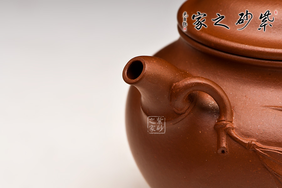 壺身做工圓潤細(xì)膩,壺把,壺嘴皆為竹節(jié)設(shè)計,生動自然,挺拔清秀。壺嘴處延伸來幾片竹葉,頓時增加了整把壺的生氣。身筒的線條處理展現(xiàn)竹節(jié)內(nèi)斂的特色,不張揚(yáng)不狂妄,竹葉的布局體現(xiàn)竹葉隨風(fēng)飄逸的勁道。
