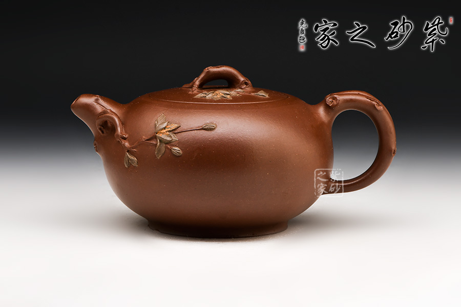 此壺器型飽滿,貼花的玉蘭尤其真切,色彩鮮明。流嘴、拱形鈕和耳形圓把粗細(xì)相當(dāng),皆作花枝形態(tài),工藝純熟,整體到位,泥料純正,手感舒服。