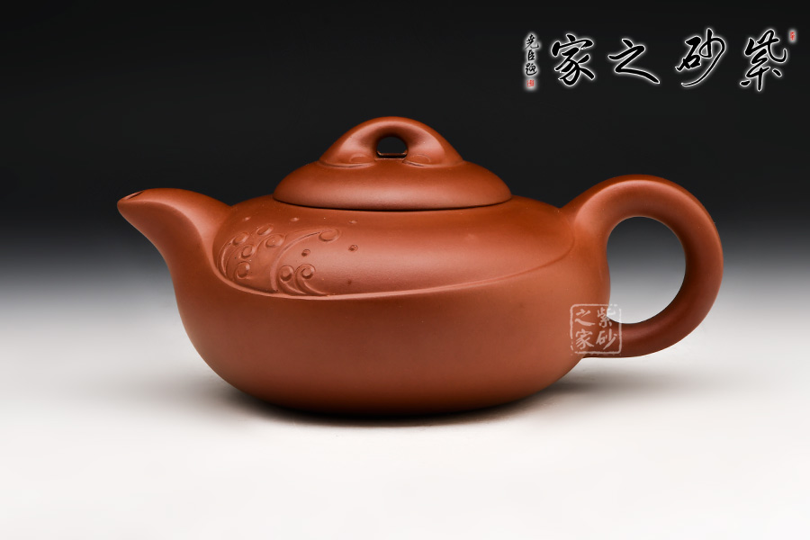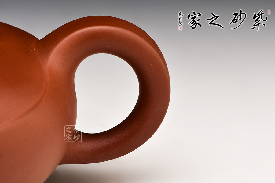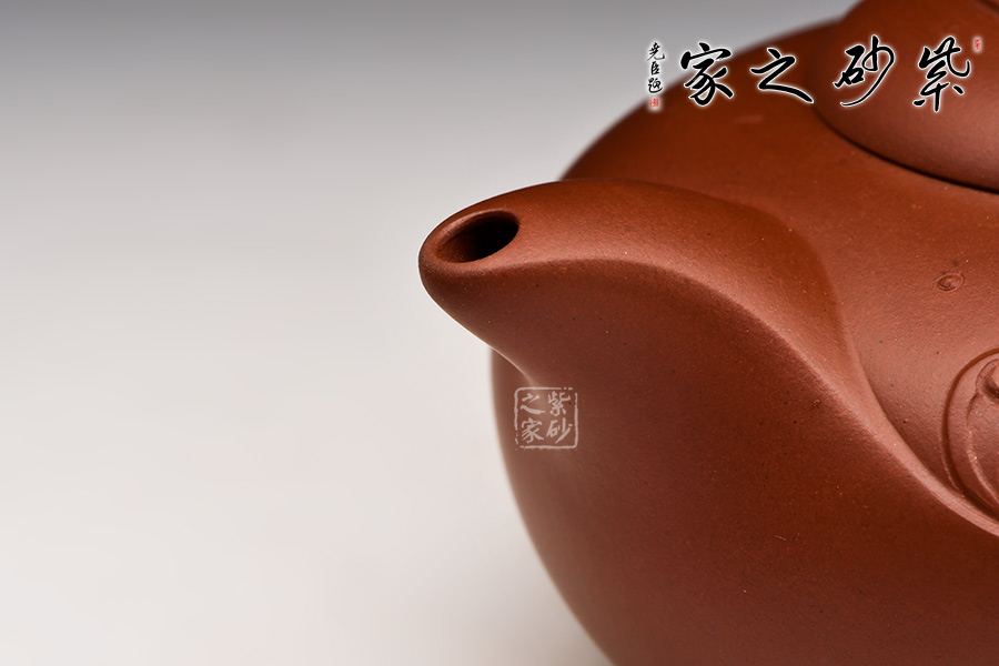 這款“紫氣東來”,以名字就可知此作的非凡大氣。圓扁的壺身,壺腹豐腴;壓蓋微鼓起,其上拱形鈕設(shè)計,新穎別致,細節(jié)把握到位;彎嘴耳形把,壺嘴端口稍平,出、斷水利落,把握方便。