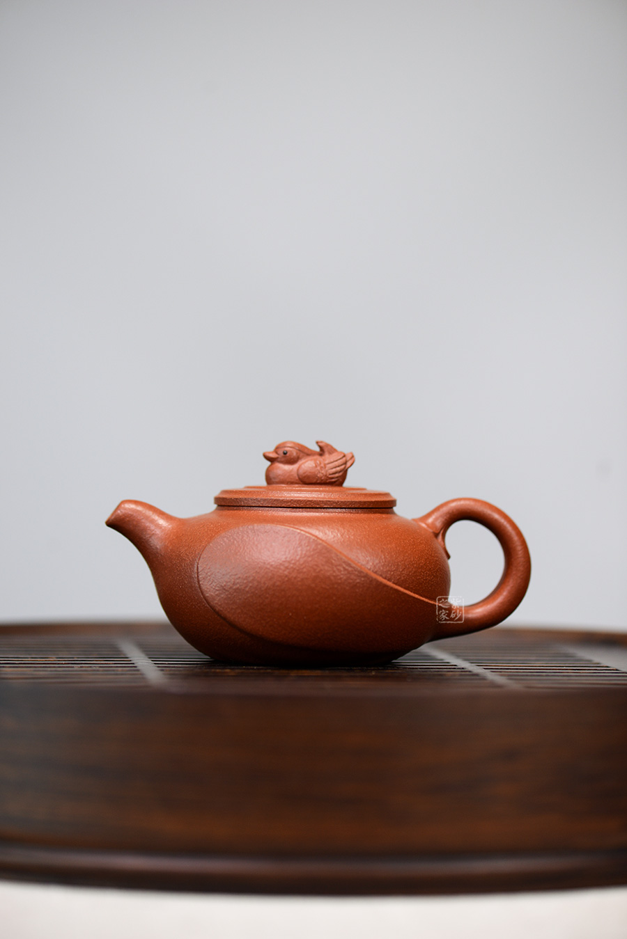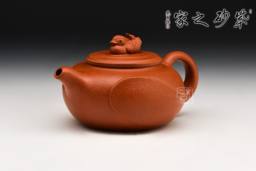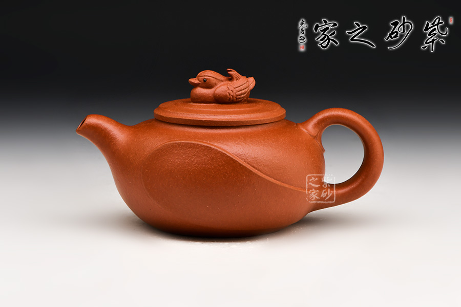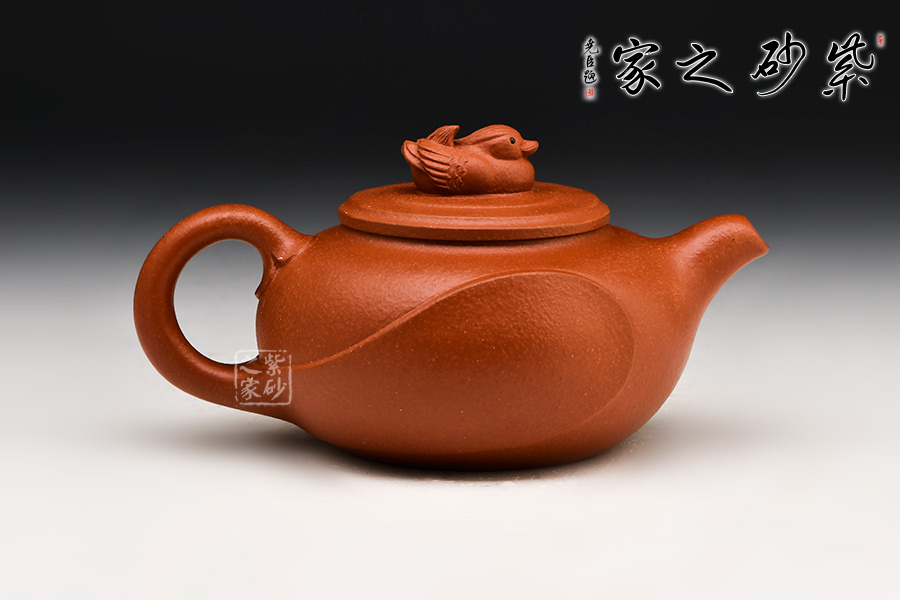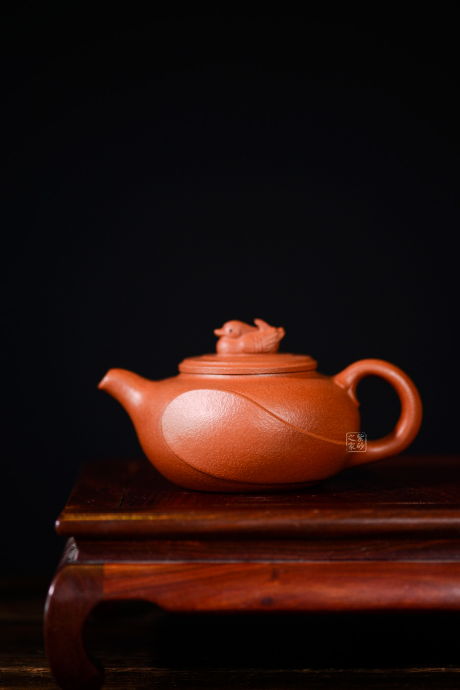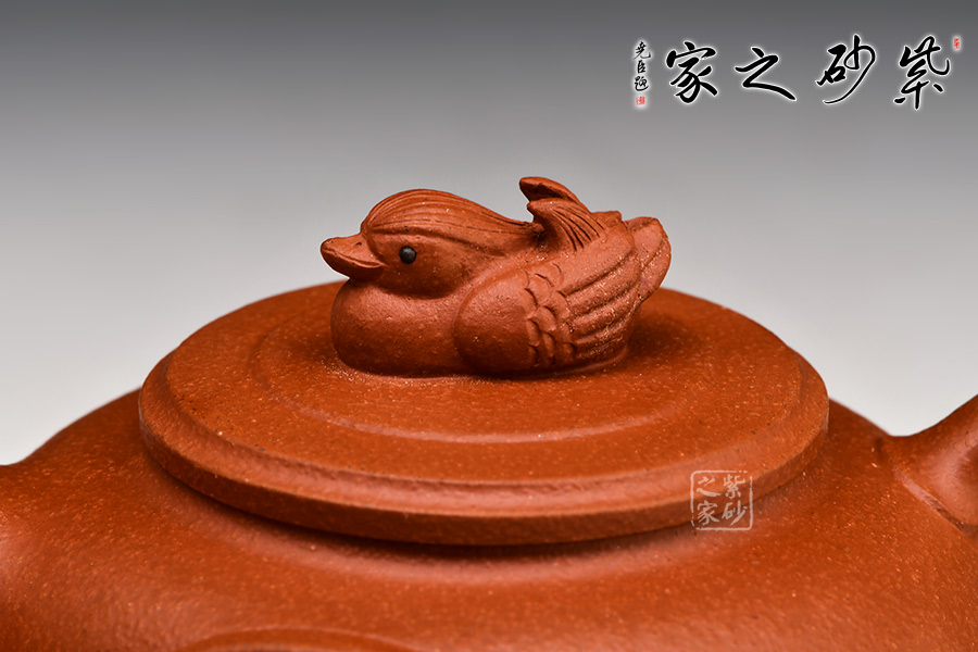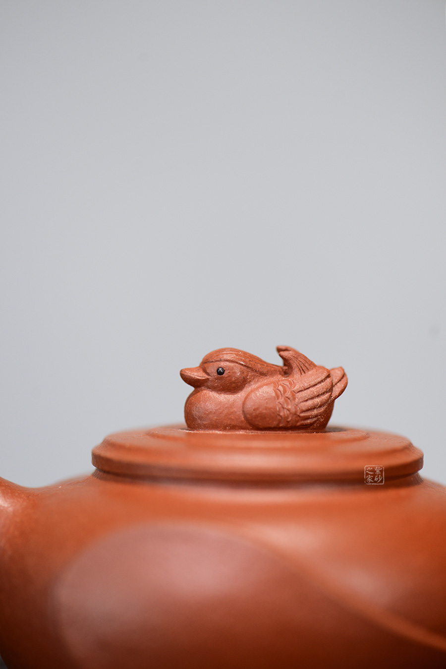 “和氣鴛鴦”造型極具獨特性,壺身光潤溫和,其上塊面設(shè)計,猶如鴛鴦的翅膀,處理非常到位;壺嘴、壺把以傳統(tǒng)的形式展現(xiàn),即傳承了經(jīng)典又不失和諧;點睛之處在于壺鈕的設(shè)計,飾一鴛鴦,形象自然,栩栩如生,甚是精致巧妙。整器規(guī)整細(xì)膩,大巧若工,是難得的佳作!