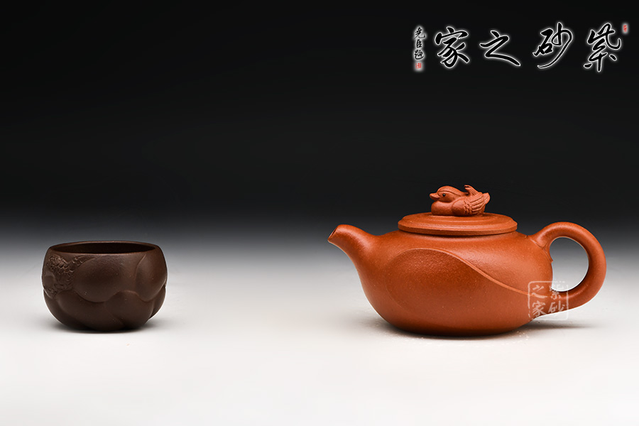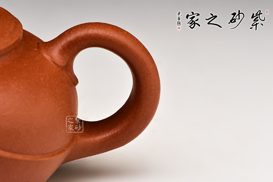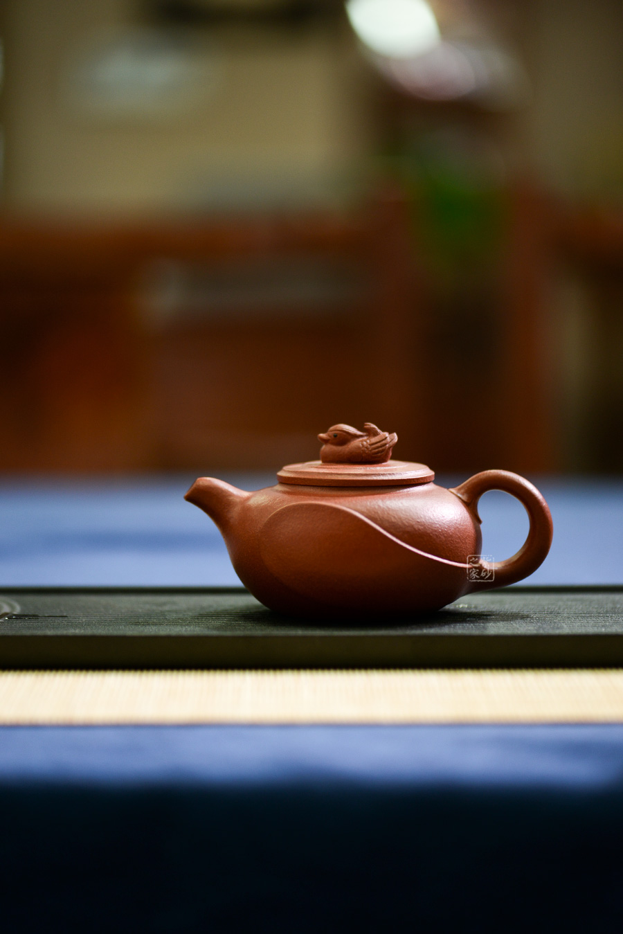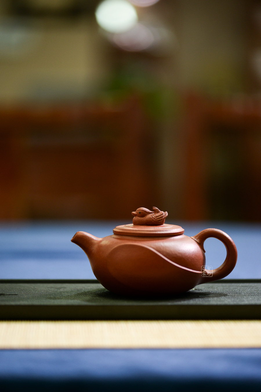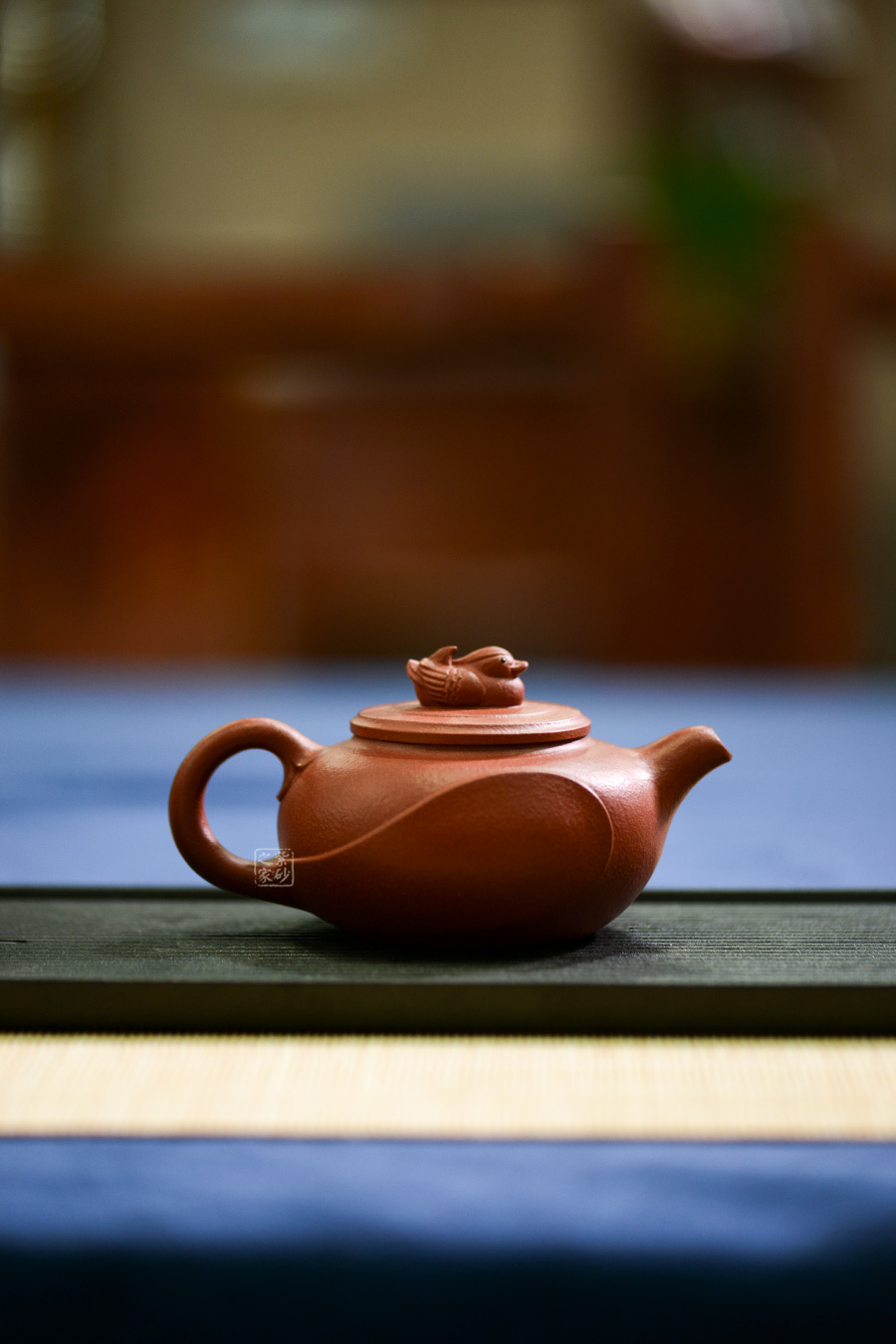 “和氣鴛鴦”造型極具獨特性,壺身光潤溫和,其上塊面設(shè)計,猶如鴛鴦的翅膀,處理非常到位;壺嘴、壺把以傳統(tǒng)的形式展現(xiàn),即傳承了經(jīng)典又不失和諧;點睛之處在于壺鈕的設(shè)計,飾一鴛鴦,形象自然,栩栩如生,甚是精致巧妙。整器規(guī)整細(xì)膩,大巧若工,是難得的佳作!