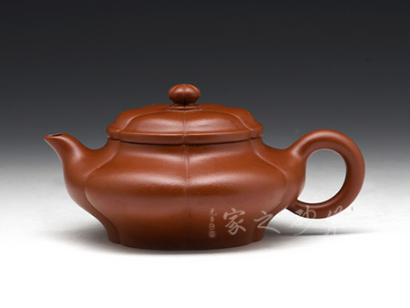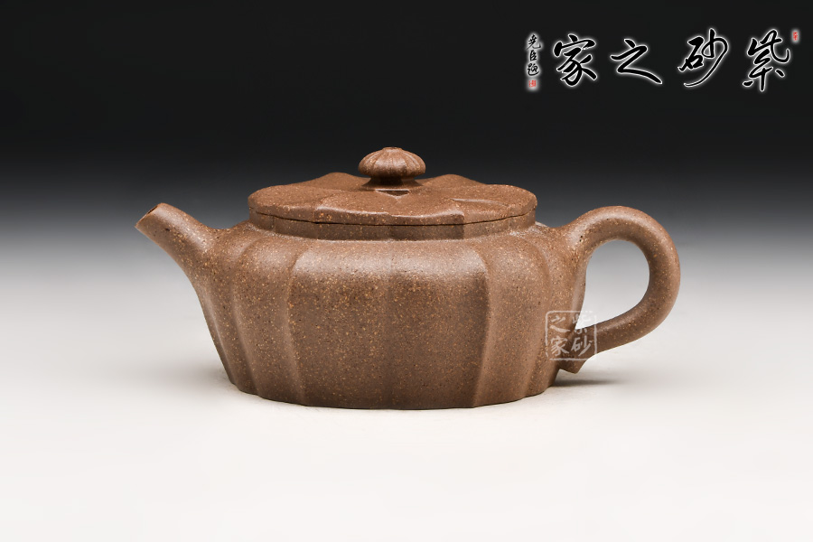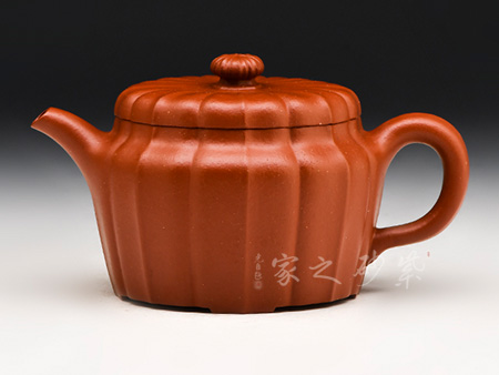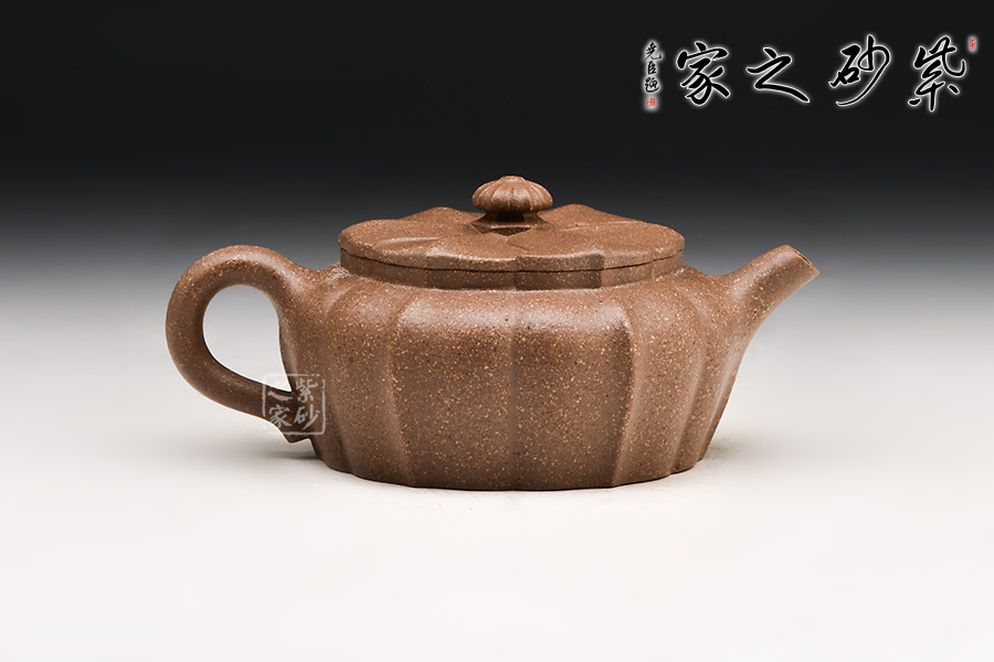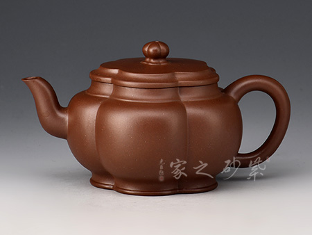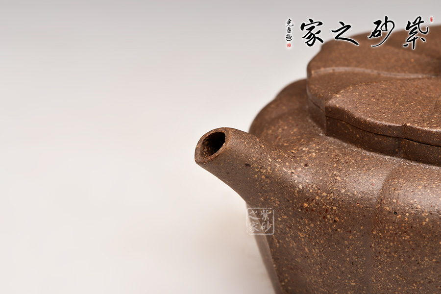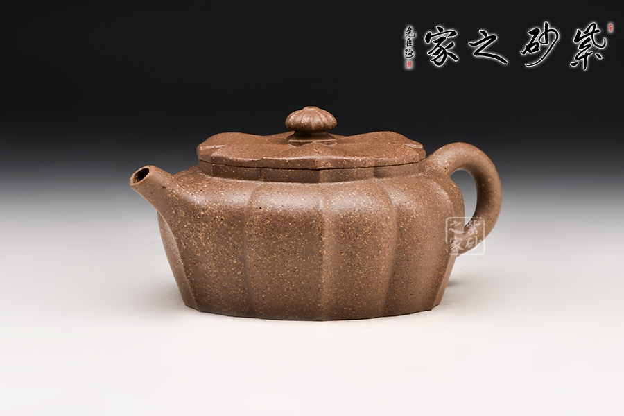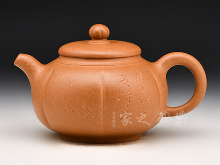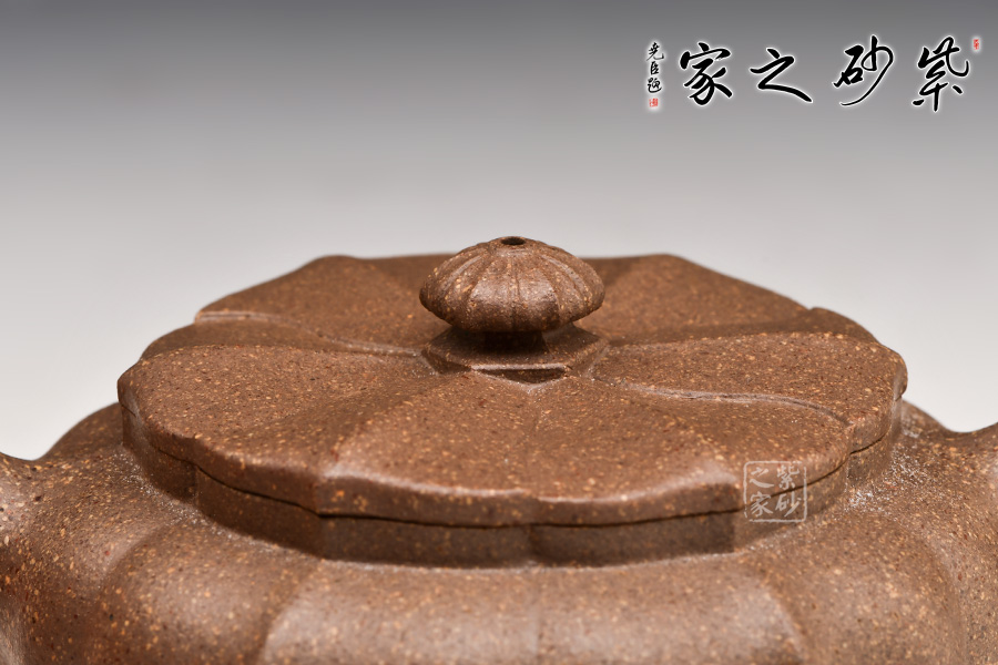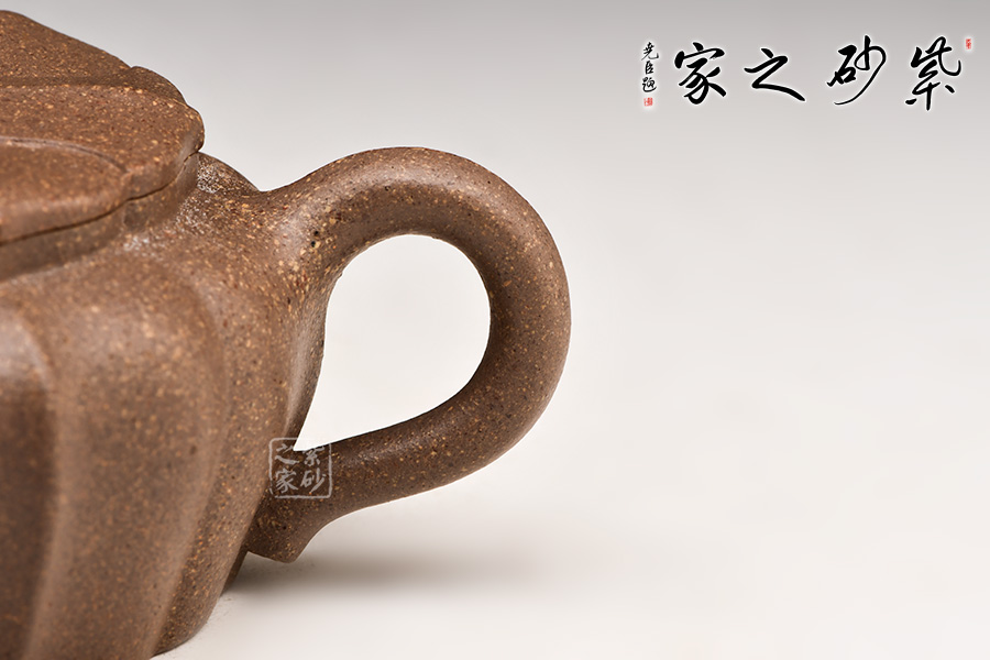 此器即以菊花發(fā)展變化而來,壺身筋囊飽滿,紋路清晰,線條明快,手法干凈利落,自壺鈕至壺底皆以筋紋一以貫之,口蓋吻合嚴(yán)密,壺嘴與耳形把前后相應(yīng)。