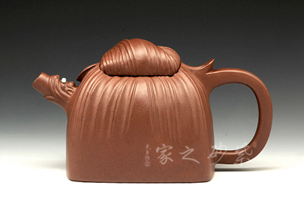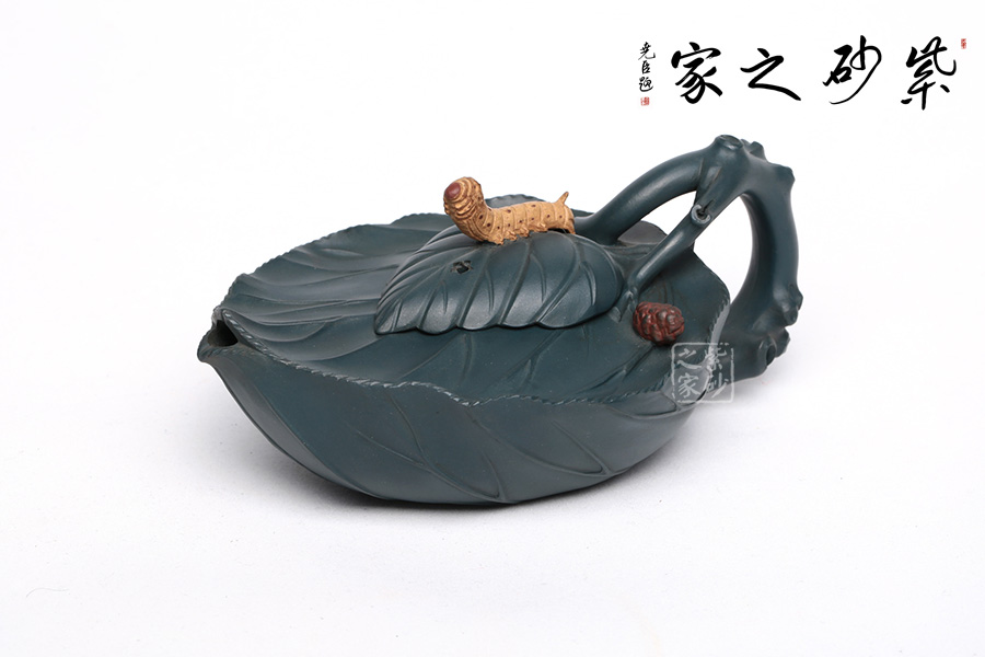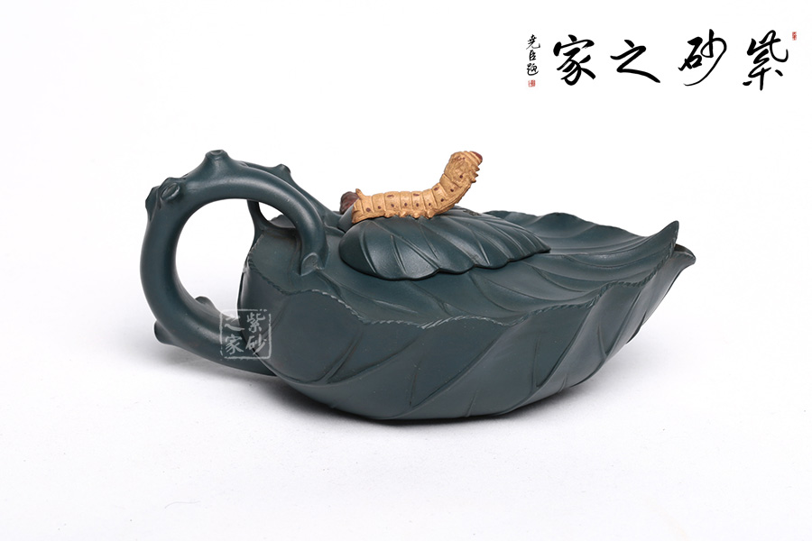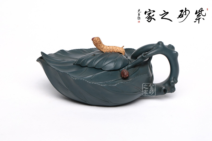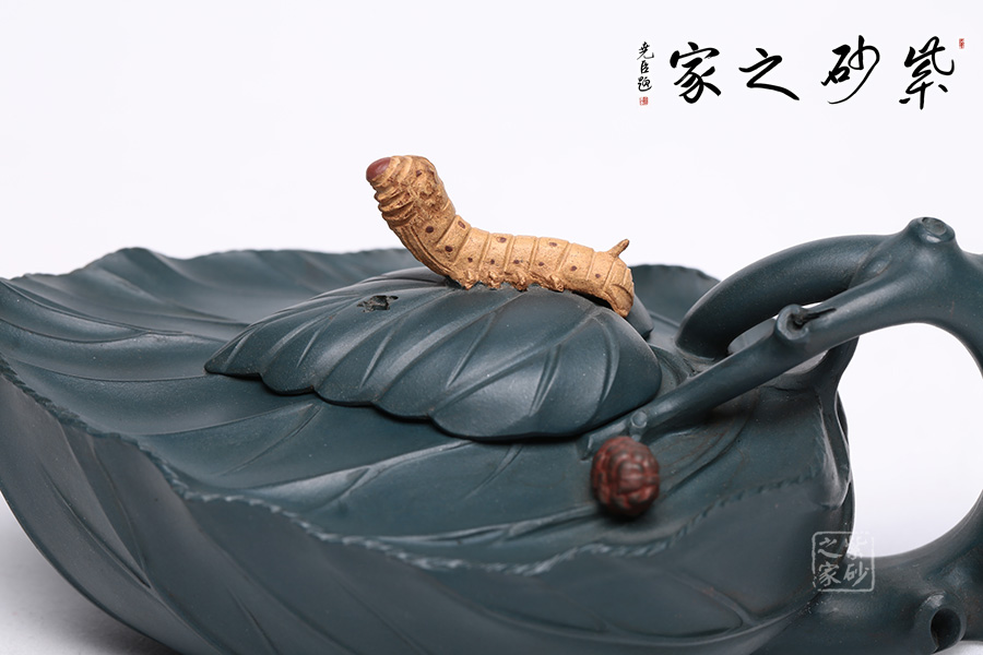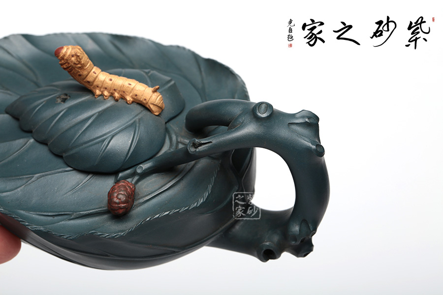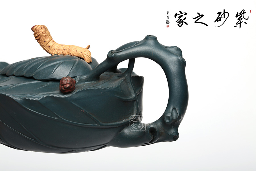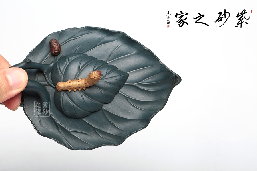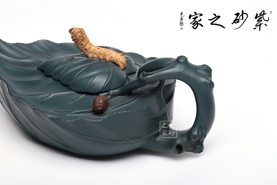 桑寶壺是謝曼倫老師的經(jīng)典代表作之一。此壺的創(chuàng)作來(lái)源于老師對(duì)生活的發(fā)現(xiàn),整器以一片樹(shù)葉為型,樹(shù)葉紋理清晰自然,十分逼真細(xì)膩。壺蓋以略小樹(shù)葉設(shè)計(jì),壺蓋上的蠶寶寶作昂首狀,正汲取生命之養(yǎng)分。壺體上碩大的桑果栩栩如生,令人垂涎欲滴,顯示了大自然旺盛的生機(jī),同時(shí)也留下許多兒時(shí)的美好回憶!