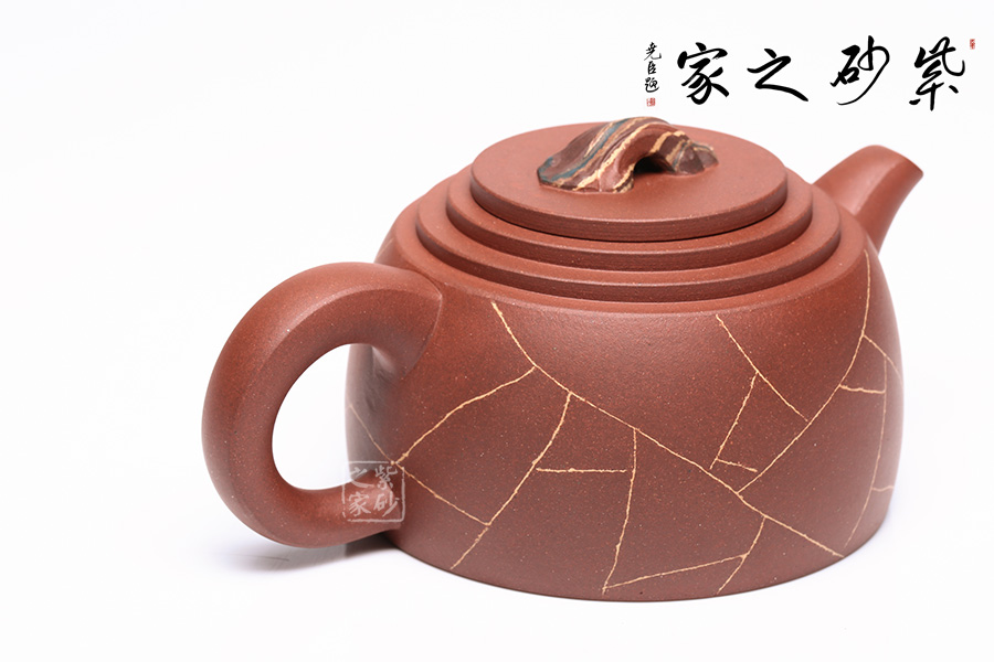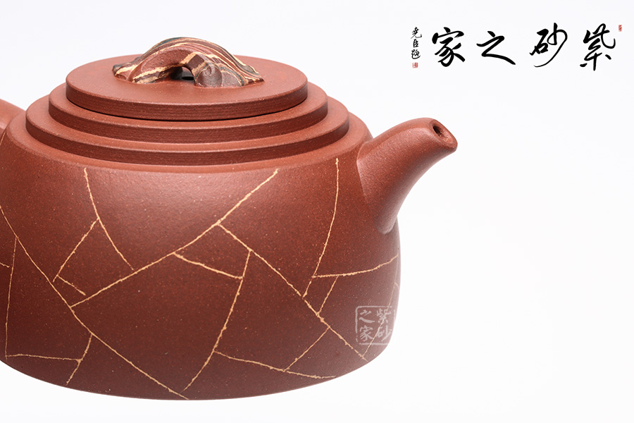 此作品大膽借鑒青瓷哥窯“開片”的裝飾手法,不規(guī)則線條極具現(xiàn)代美感。此壺紫砂色潤(rùn)而華美,細(xì)紋如開片冰紋,有自然奇趣。