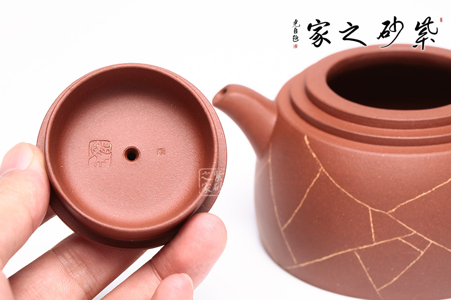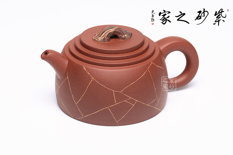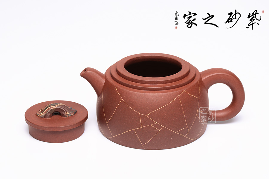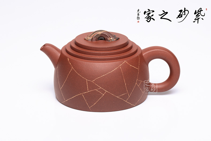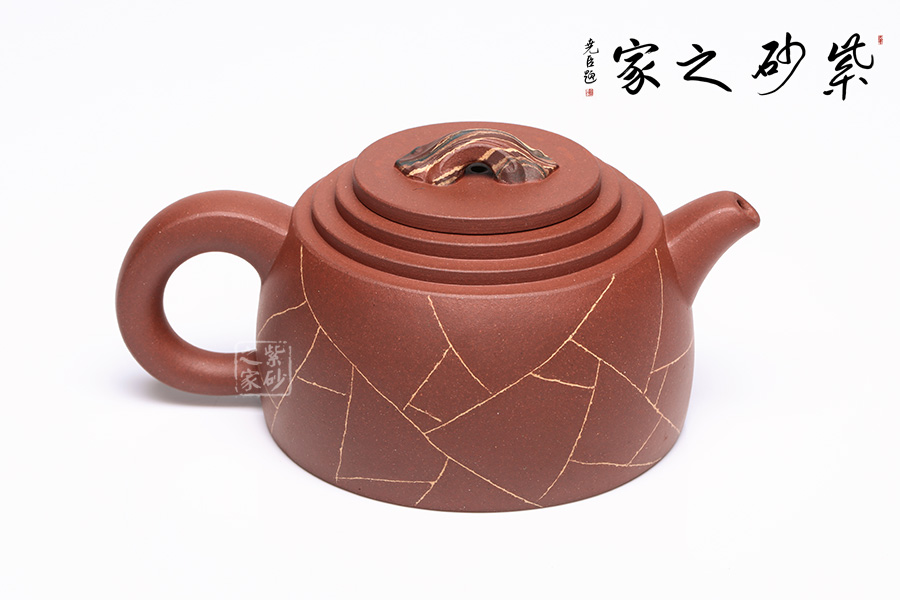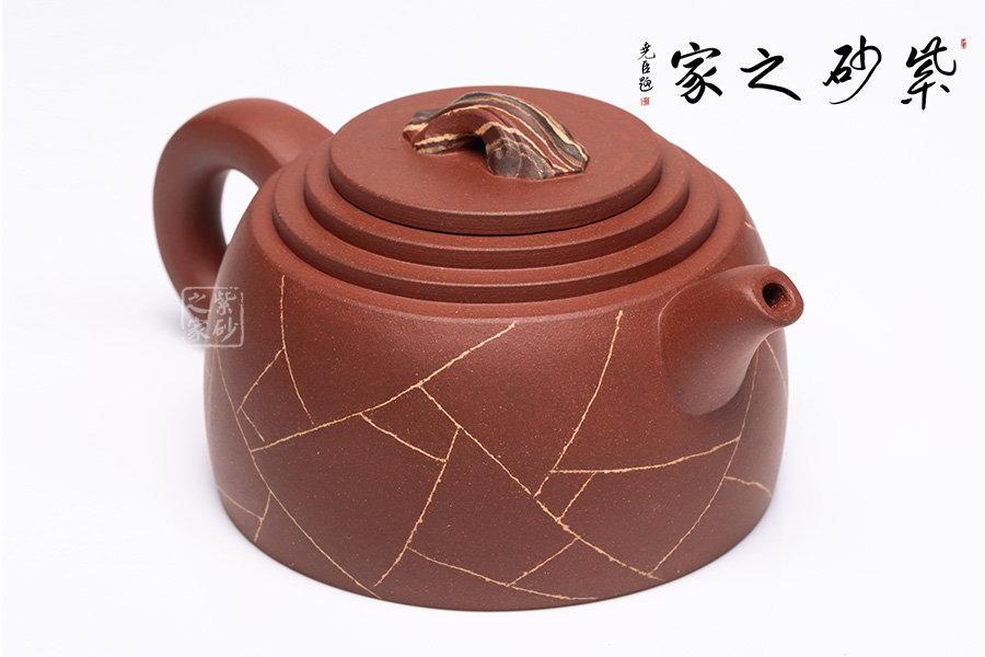 該壺的點(diǎn)睛之筆是壺肩至壺蓋過(guò)渡采用了步步高升的臺(tái)階式造型,巧妙寓意“步步高”,含蓄別致,簡(jiǎn)潔之中又使作品具有現(xiàn)代感,體現(xiàn)出作者過(guò)人的膽識(shí)與創(chuàng)作的自信。