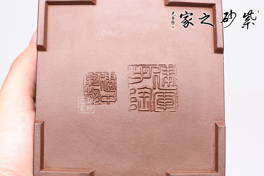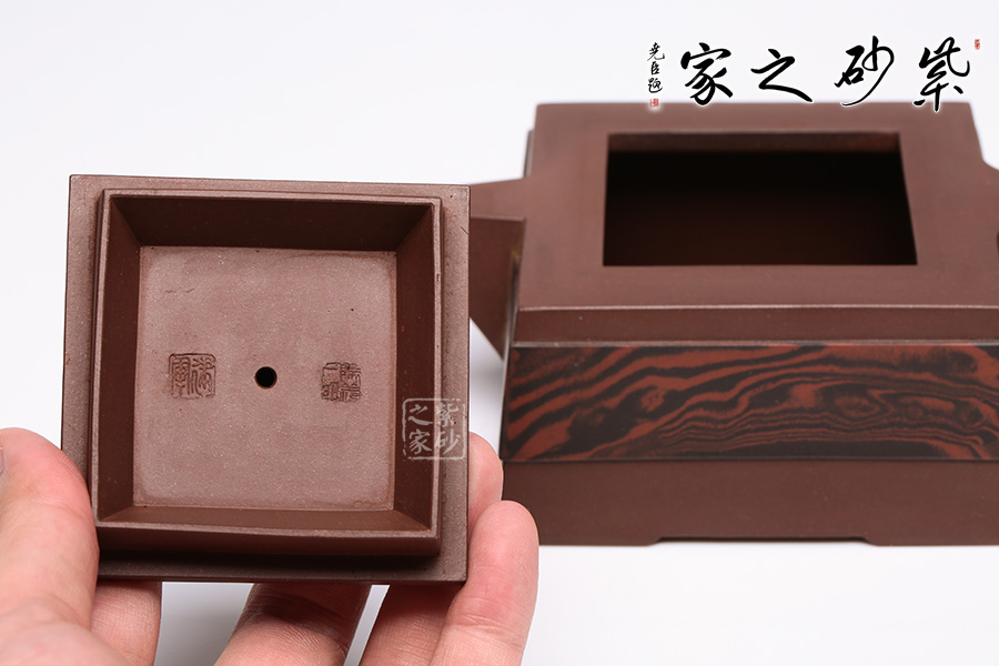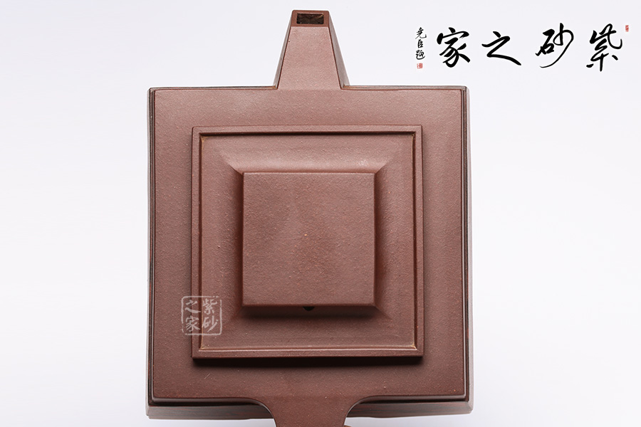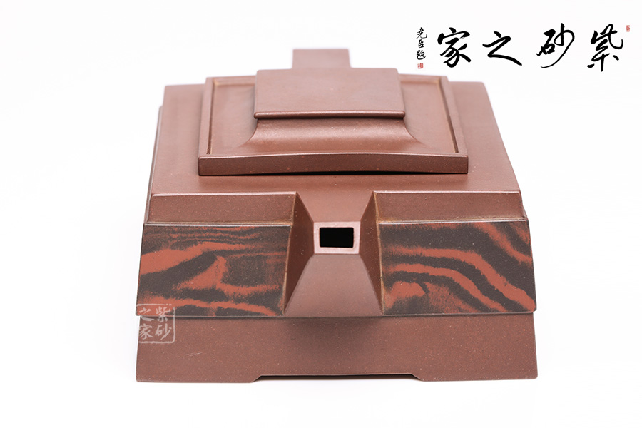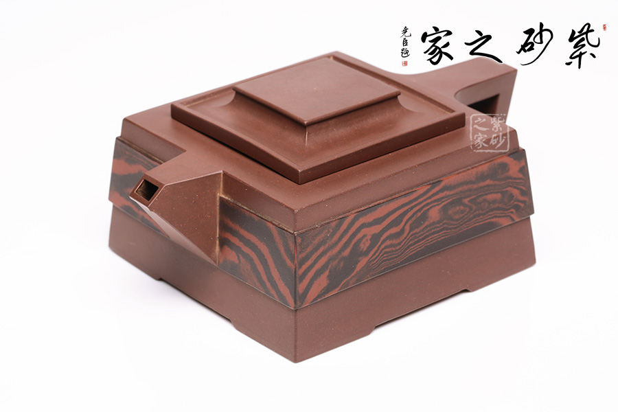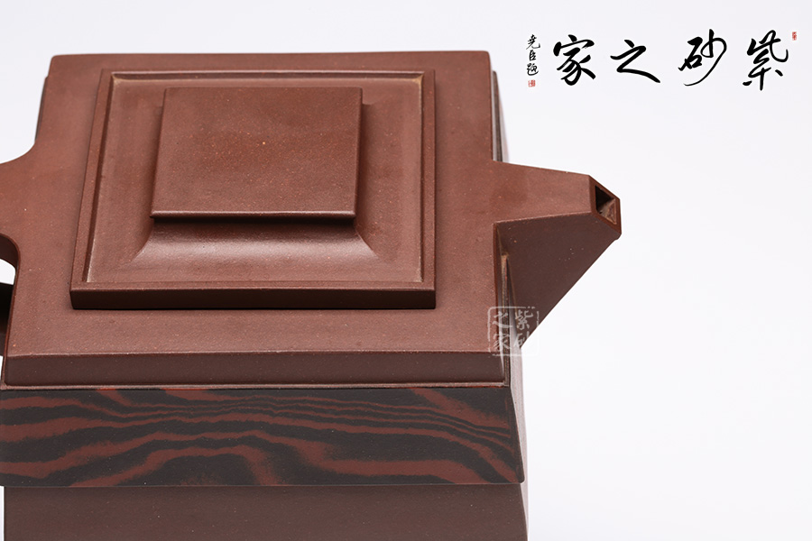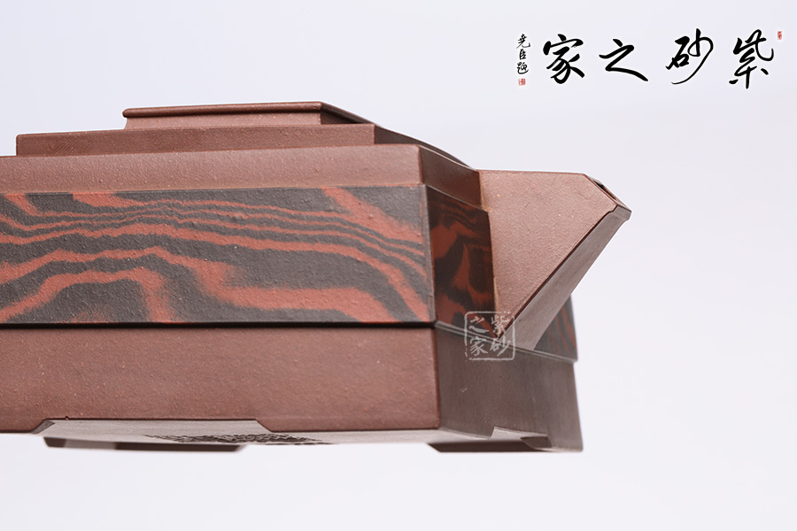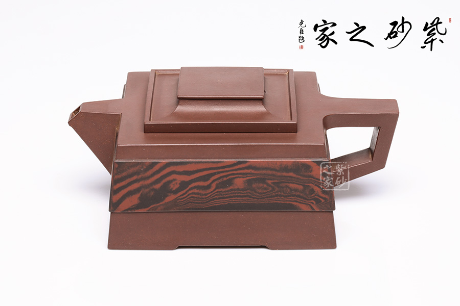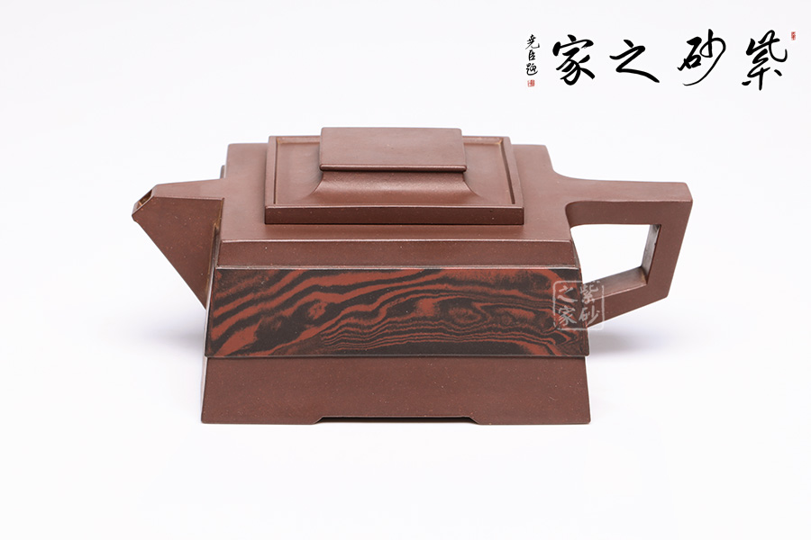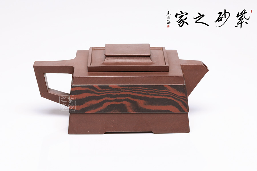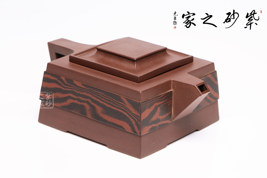 此壺呈四方狀,整壺角對角,線對線,上下貫通,渾然一體。壺蓋可調(diào)換角度,與壺口配合嚴(yán)密,展現(xiàn)了點線面的最佳組合。方體鈕,短流式胥出,出水明快有力,折形把,剛?cè)岵?jì)。整壺線條挺括有力,氣勢恢宏,加上通身絞泥紋飾,使靜中有動,打破了方器的沉悶。