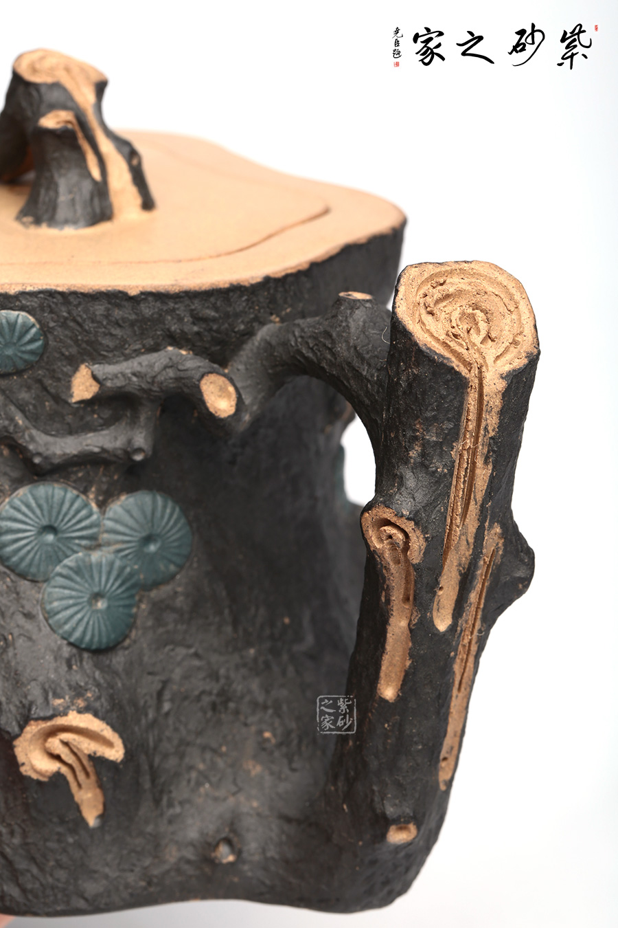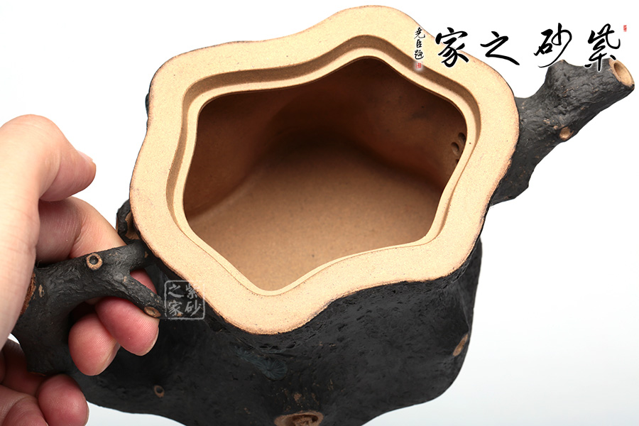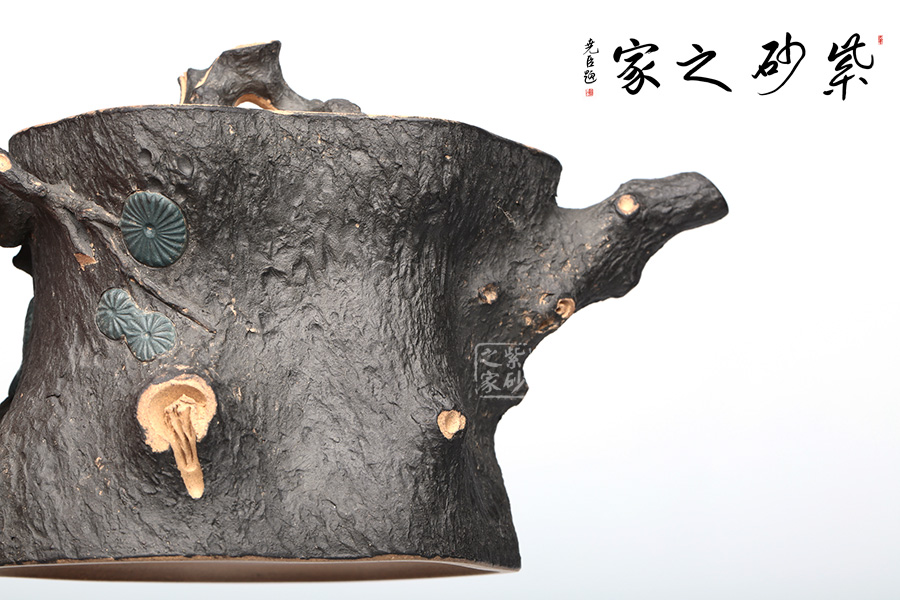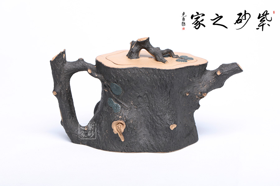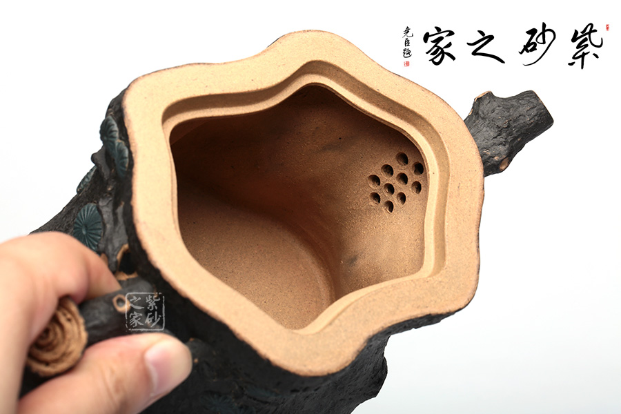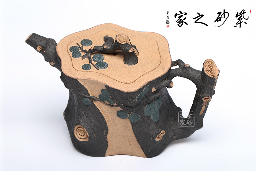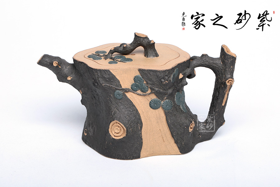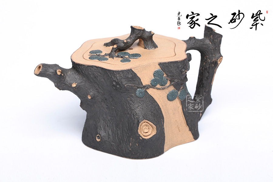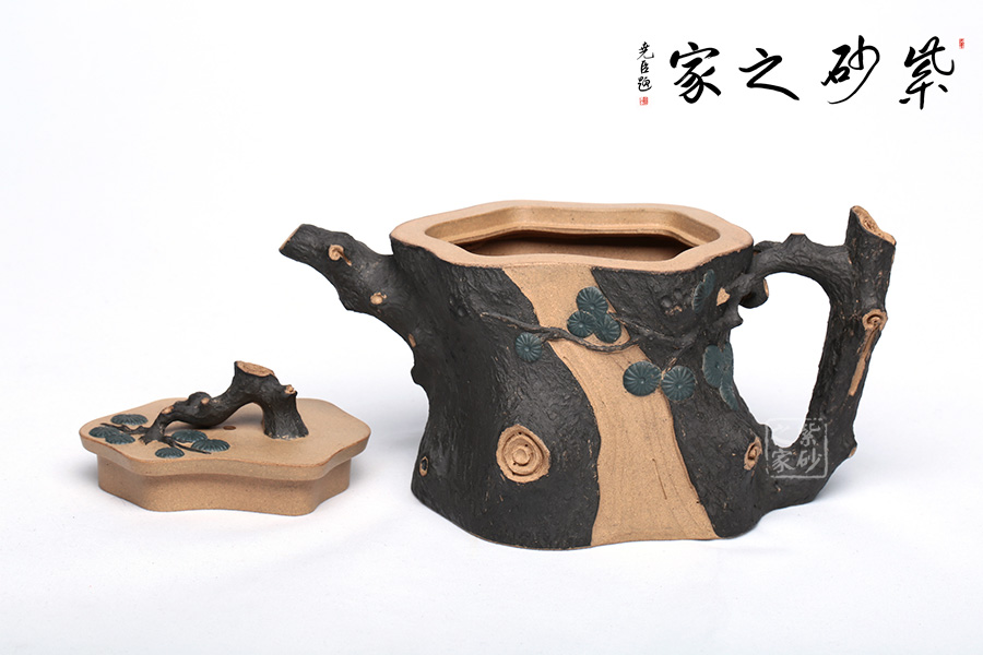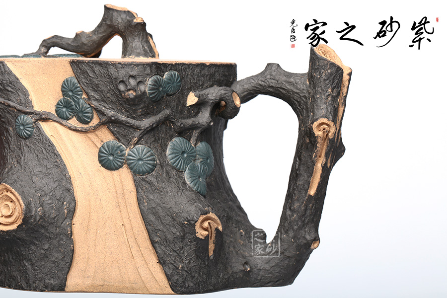 此壺精選原礦段泥制作,運(yùn)用貼花和雙色泥的裝飾技法,以一截松段做壺身,樹皮斑駁蒼勁,松枝虬蟠其上,針葉寫形亦寫意,形意俱佳。